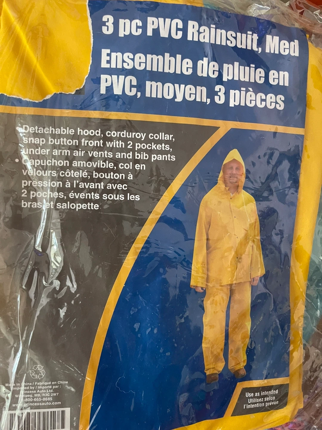Brand new in package. Selling a 3-piece PVC rainsuit in size medium! It includes a detachable hood, corduroy collar, snap button front with 2 pockets, under arm air vents and bib pants. Perfect for staying dry on those rainy days! Also great for camping 🏕️ Lobby Pick Up.