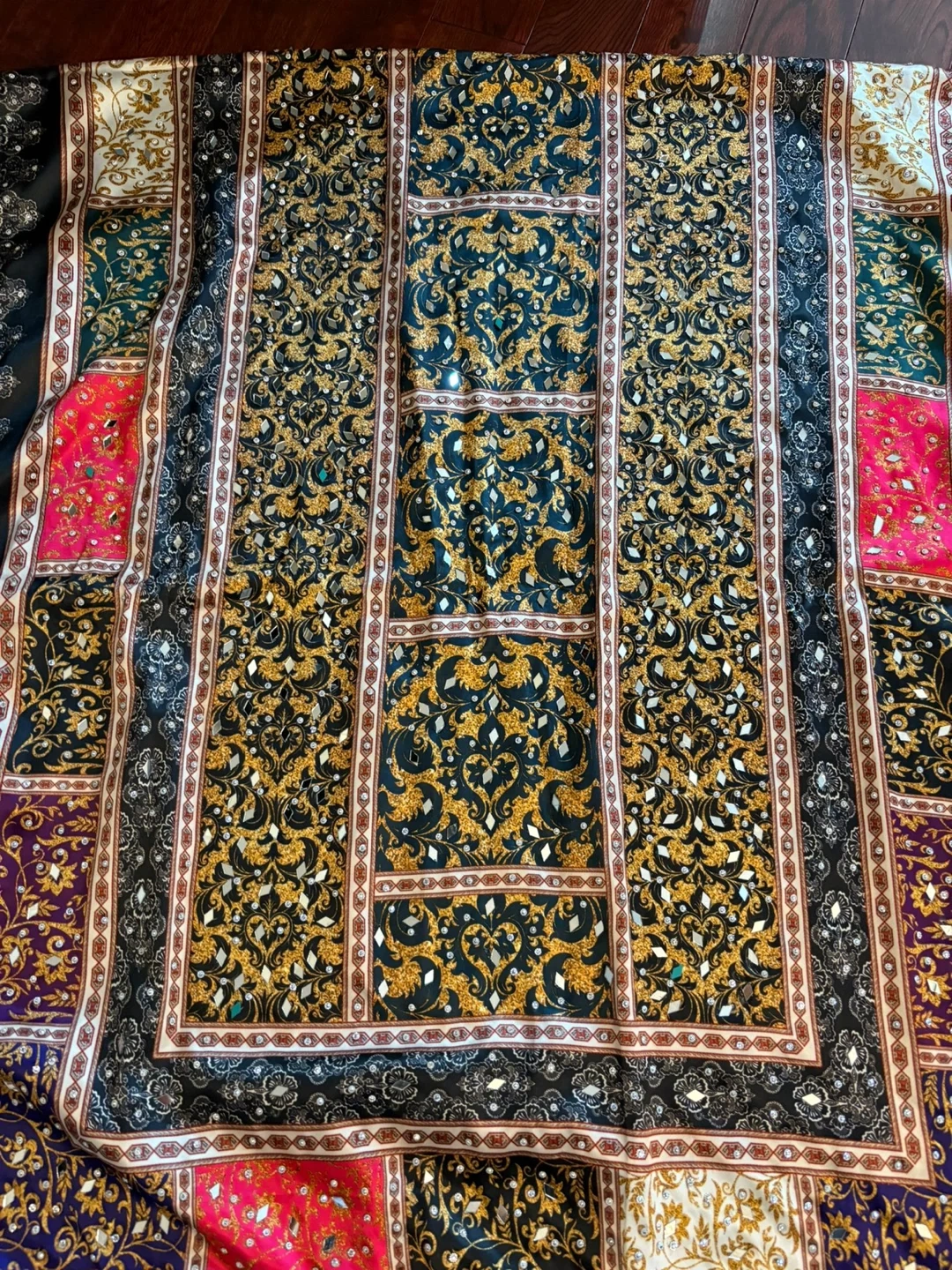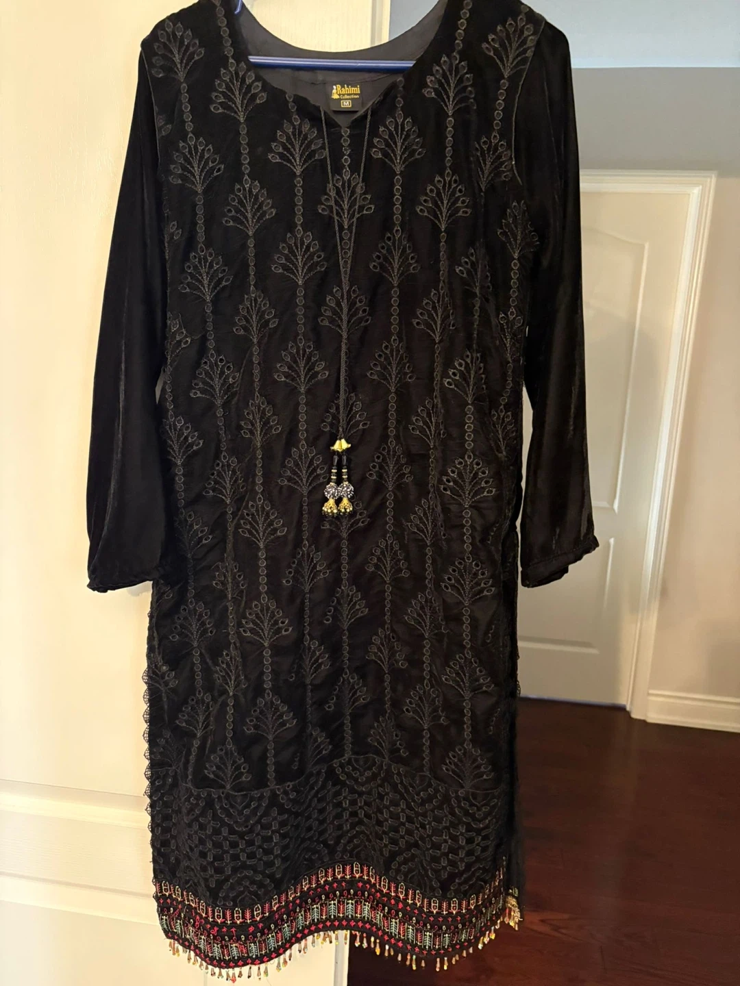 218Beautiful Mahimi brand black velvet salwar kameez. The kameez features intricate embroidery and the salwar has a matching embroidered hem. Perfect for a special occasion!