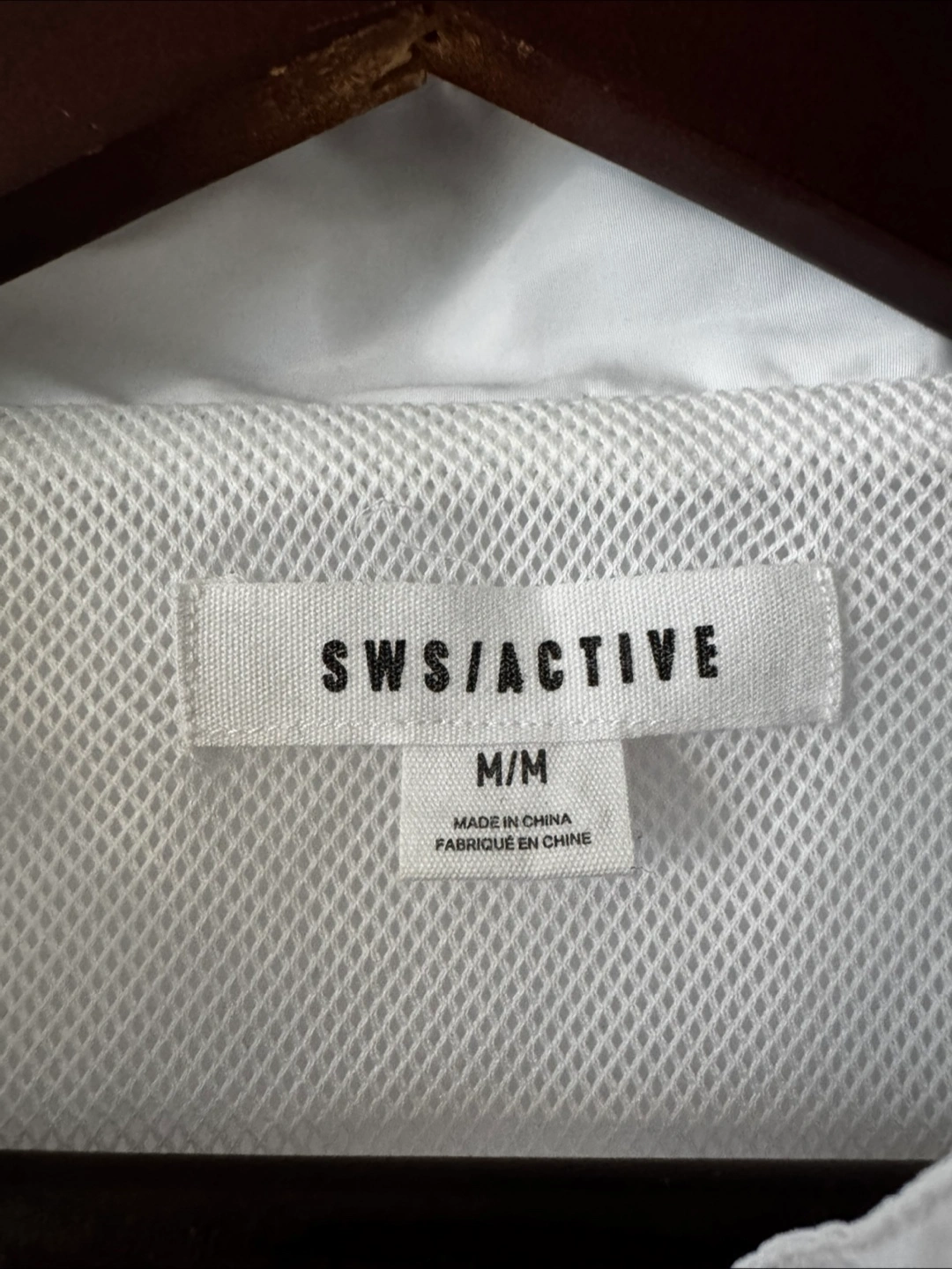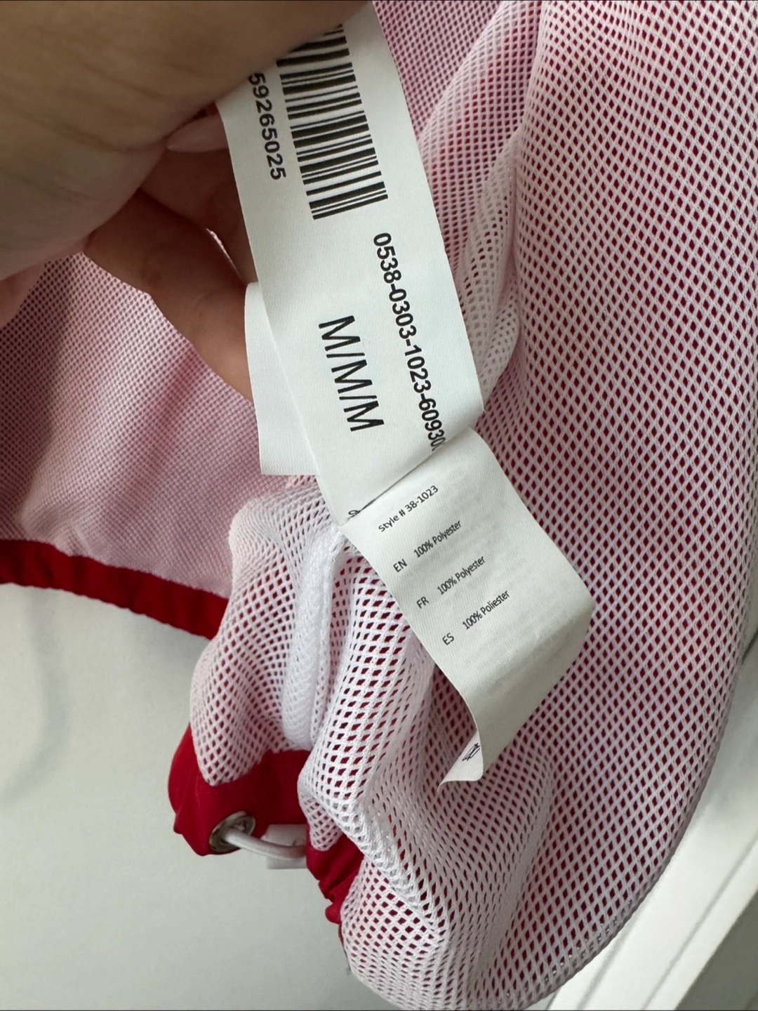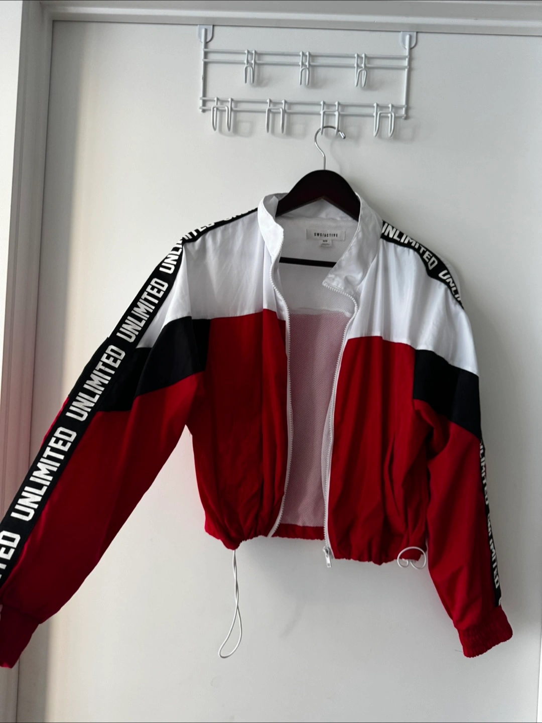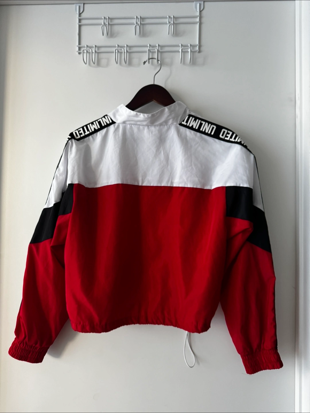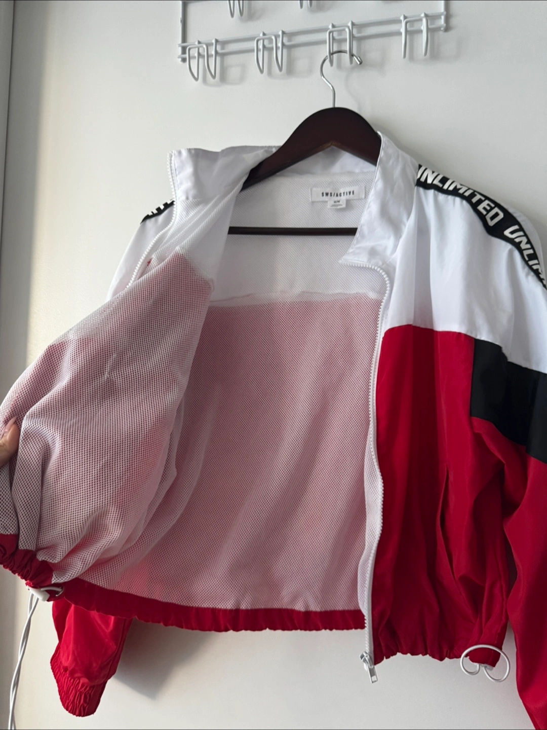 Selling a SWS/ACTIVE colour block jacket in size medium. The jacket is red, white and black, with "UNLIMITED UNLIMITED" printed on the sleeves. It's made of 100% polyester.