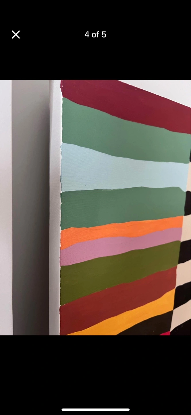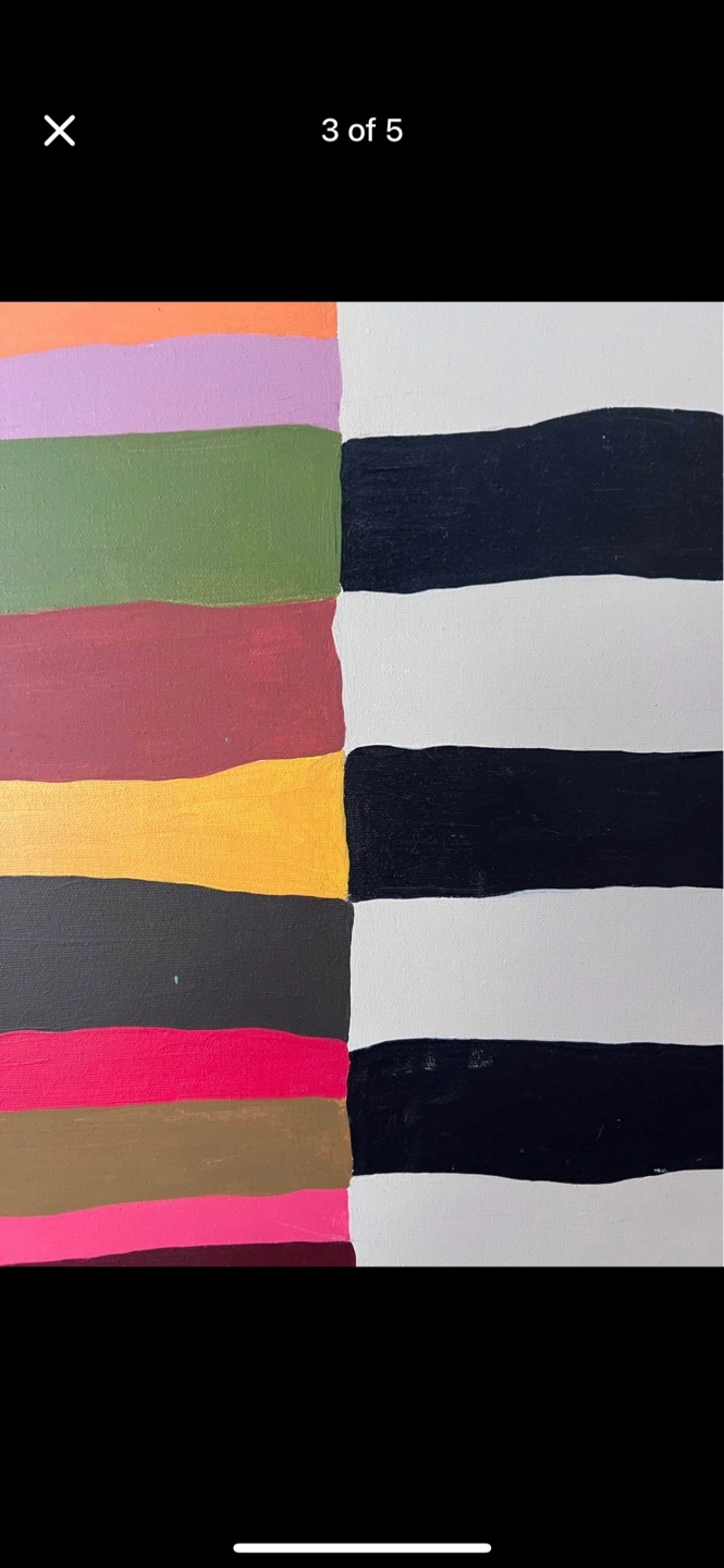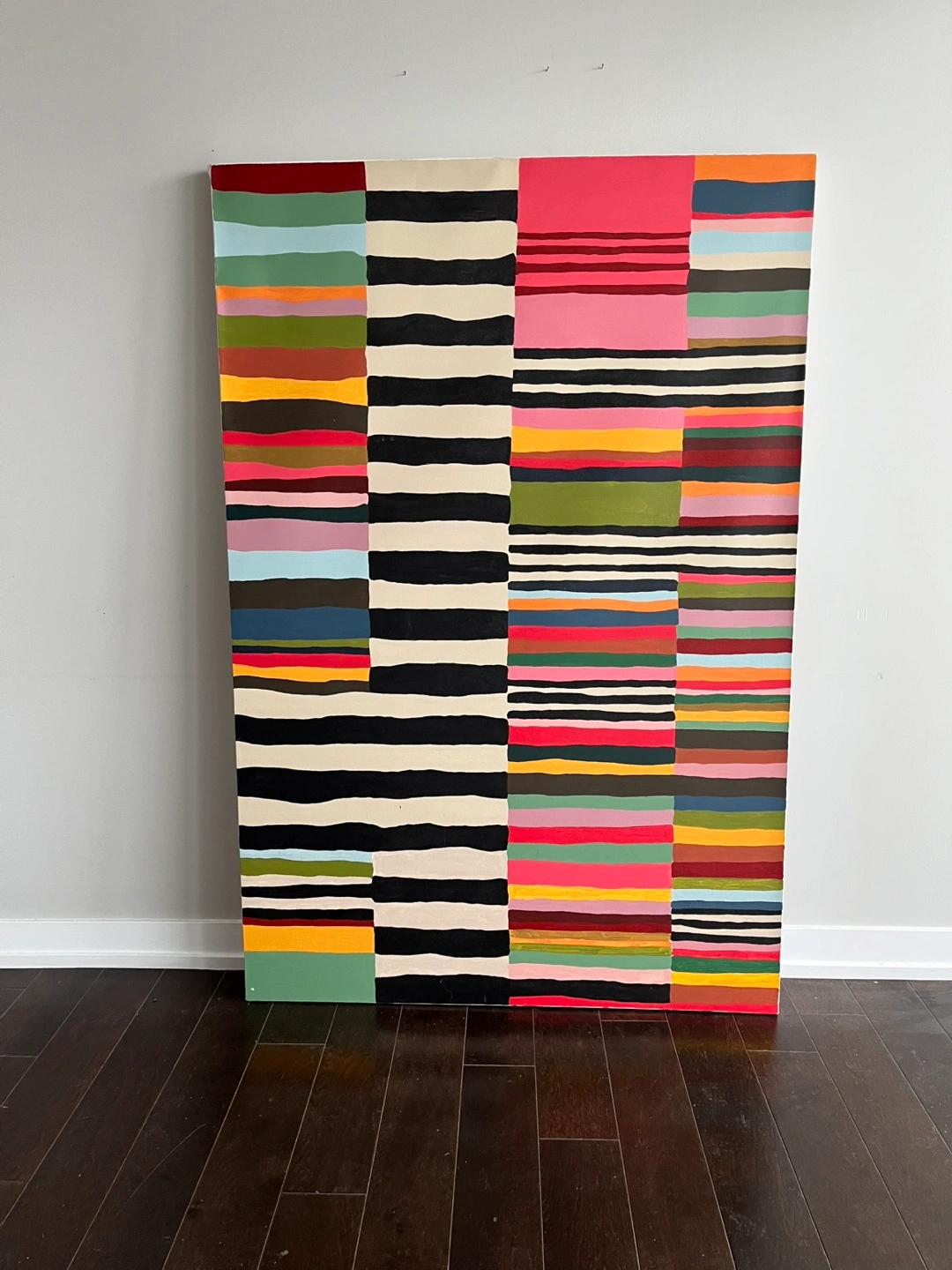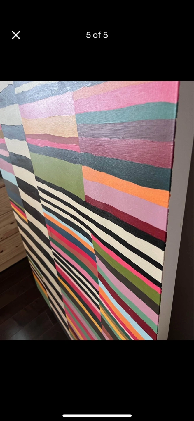 Selling a very large, vibrant abstract painting featuring bold black and white stripes with pops of pink, green, blue, and more. This eye-catching piece is perfect for sprucing up a dining room or adding a statement accent to any space.