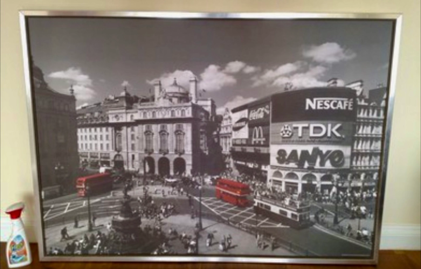 Framed print featuring a black and white image of London's Piccadilly Circus with red double-decker buses. The frame is silver. A nice piece of decor for any room. Looks pretty any hallway.