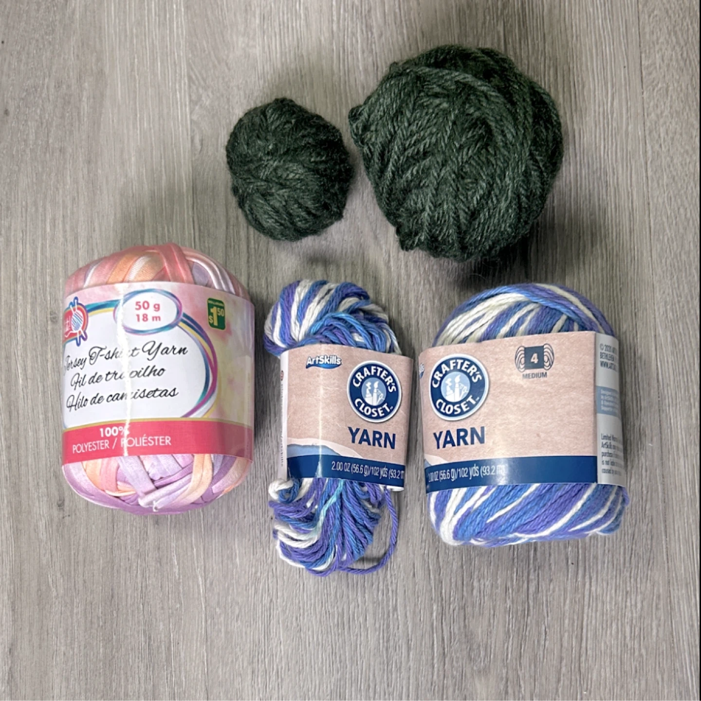 Includes two balls of green acrylic yarn, a full skein of fabric yarn and a little over 1 skein of blue and white cotton yarn.