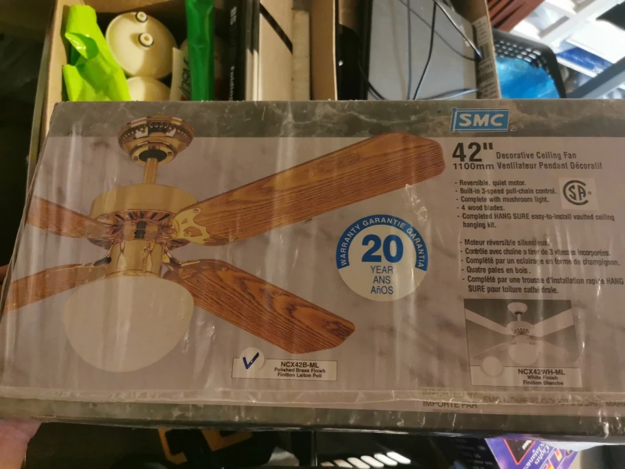 Selling a brand new SMC 42" decorative ceiling fan still in its original packaging! It has a reversible, quiet motor and a built-in 3-speed pull-chain control. It also comes complete with a mushroom light and 4 wood blades. The HANG SURE system makes for easy installation, even on vaulted ceilings