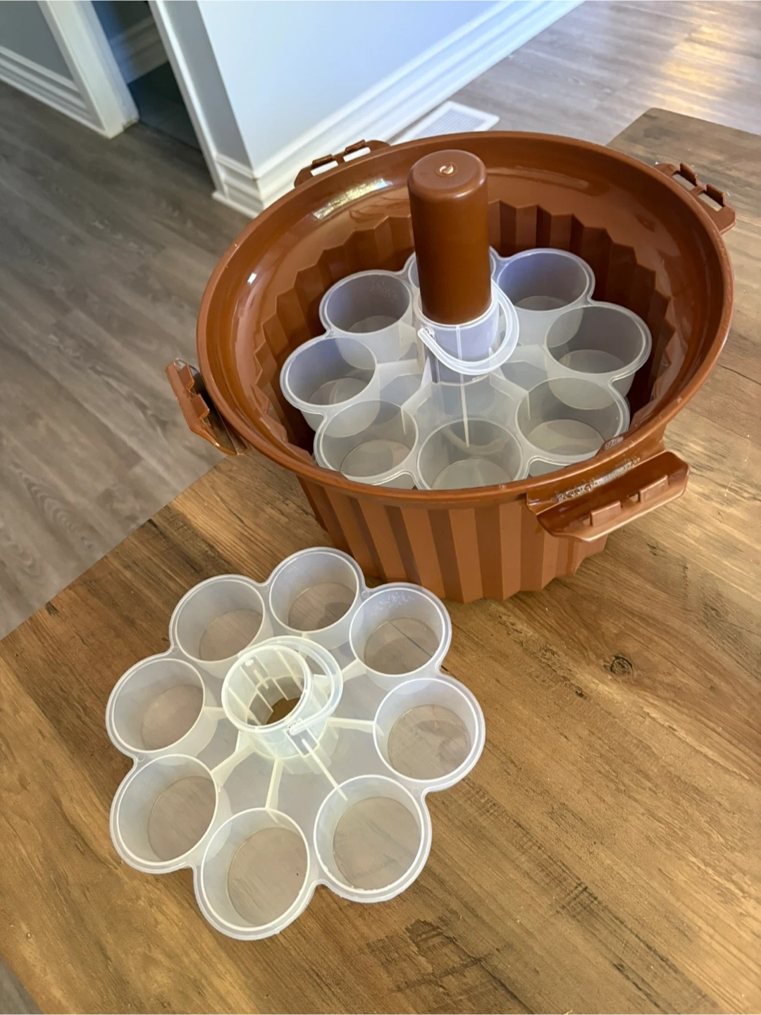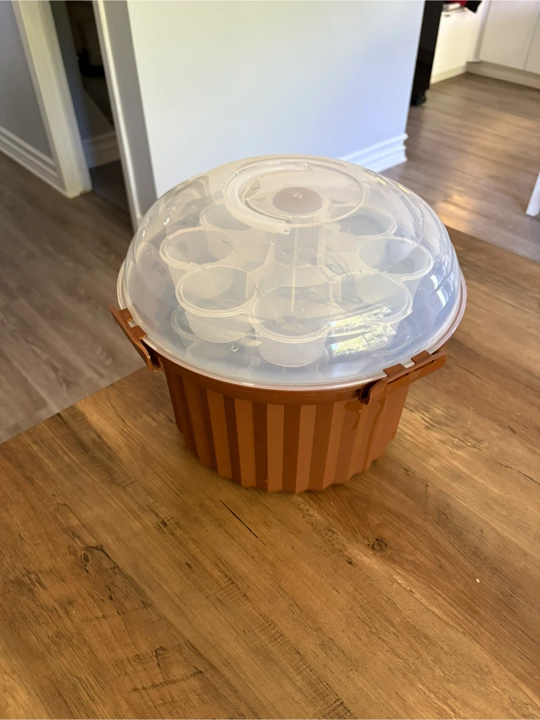 Gently used cupcake carrier with a clear lid and inserts to keep your cupcakes safe and sound during transport. It's perfect for potlucks, bake sales, or just bringing treats to friends and family. The carrier is in great condition and ready for its next baking adventure