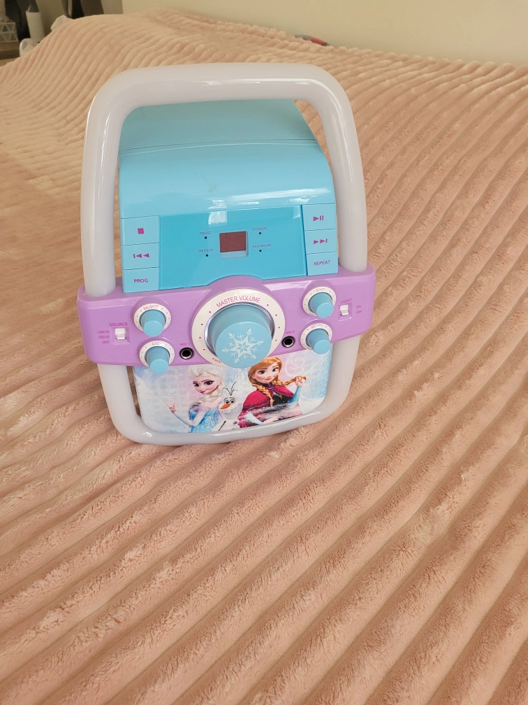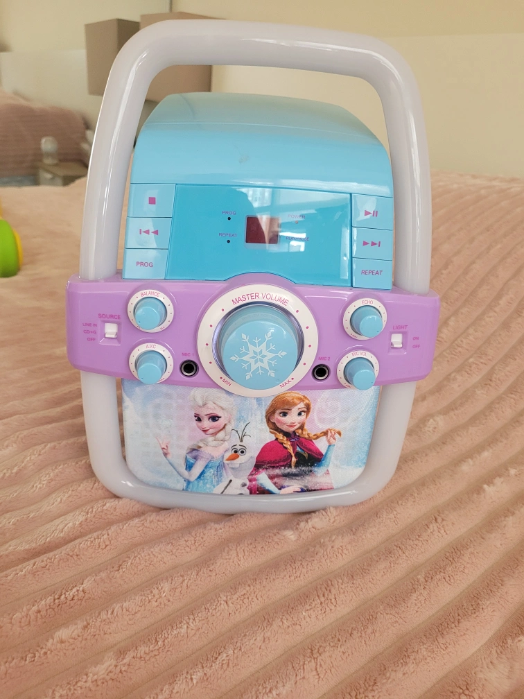 Disney Frozen 2 karaoke player! It's perfect for little ones who love to perform. Include a built-in CD player and a master volume control. It comes with a microphone.