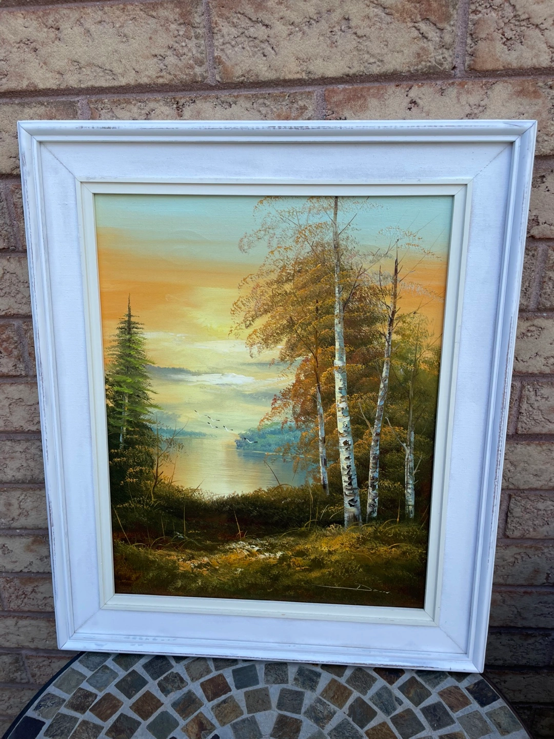 Mid century oil painting on canvas. Signed. Landscape scene. Beautiful frame. 21” by 25 1/2”. For the art enthusiast. Beautiful colour