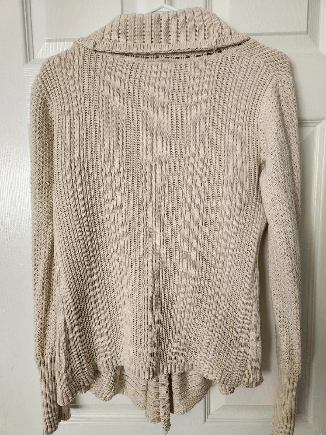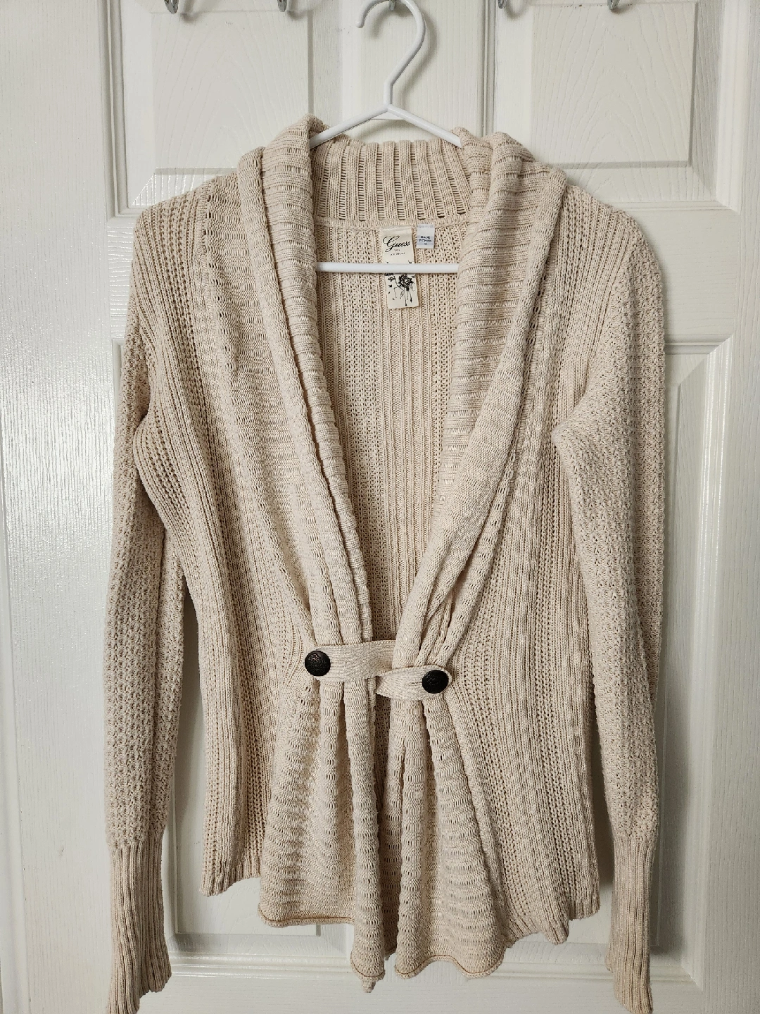 Cozy Guess Los Angeles knit cardigan in a lovely neutral colour. This cardigan is a size medium and features a unique design with a button closure. Perfect for layering on those cooler days!