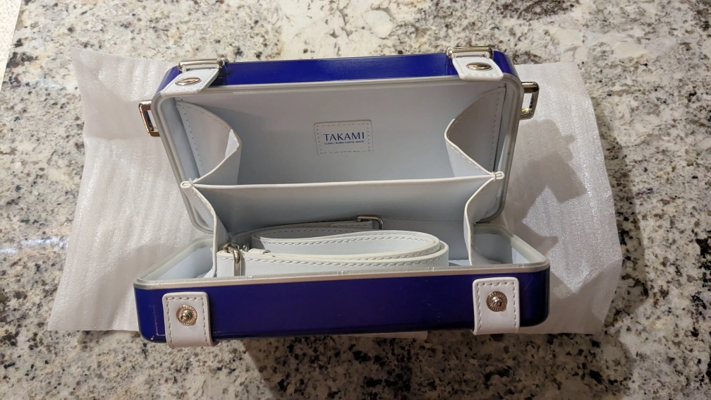 Selling a cute Takami box bag in blue and white! It's in great condition and perfect for adding a touch of elegance to any outfit. Comes with a shoulder strap