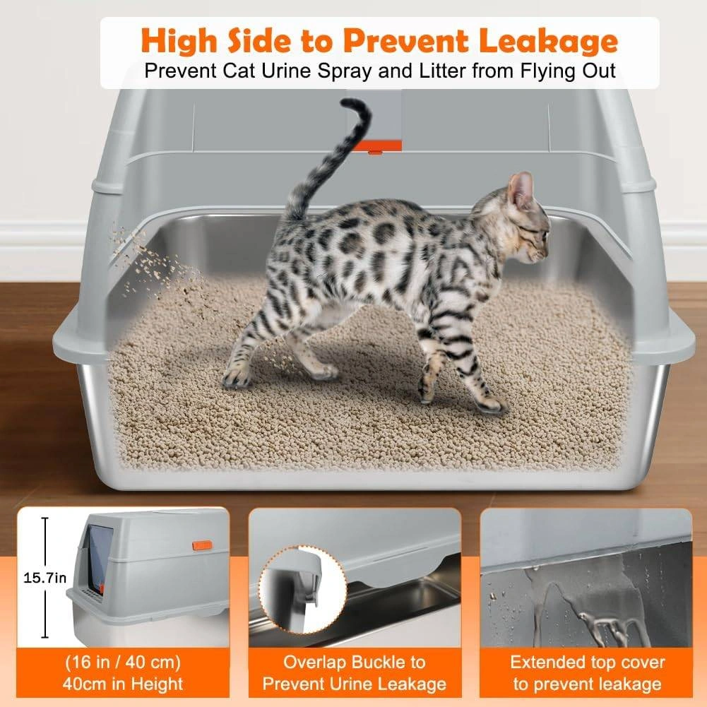 A great litter box with multiple entry options for finicky cats, and plenty of ways to stop litter tracking. Includes attached scoop & step with holes to catch litter fall.