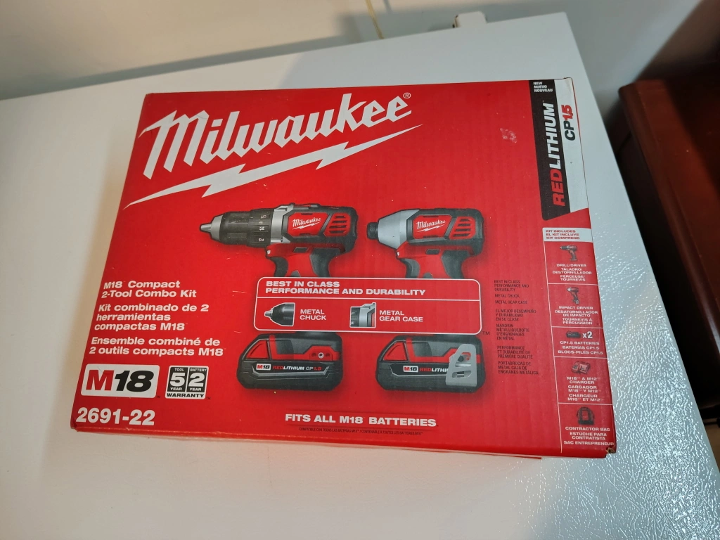 Selling a brand new Milwaukee M18 Compact 2-Tool Combo Kit. Includes the drill/driver and impact driver. The kit is designed for best in class performance and durability, featuring a metal chuck and metal gear case. It also fits all M18 batteries. Kit includes 2 tools and 2 M18 compact batteries. 5 year warranty