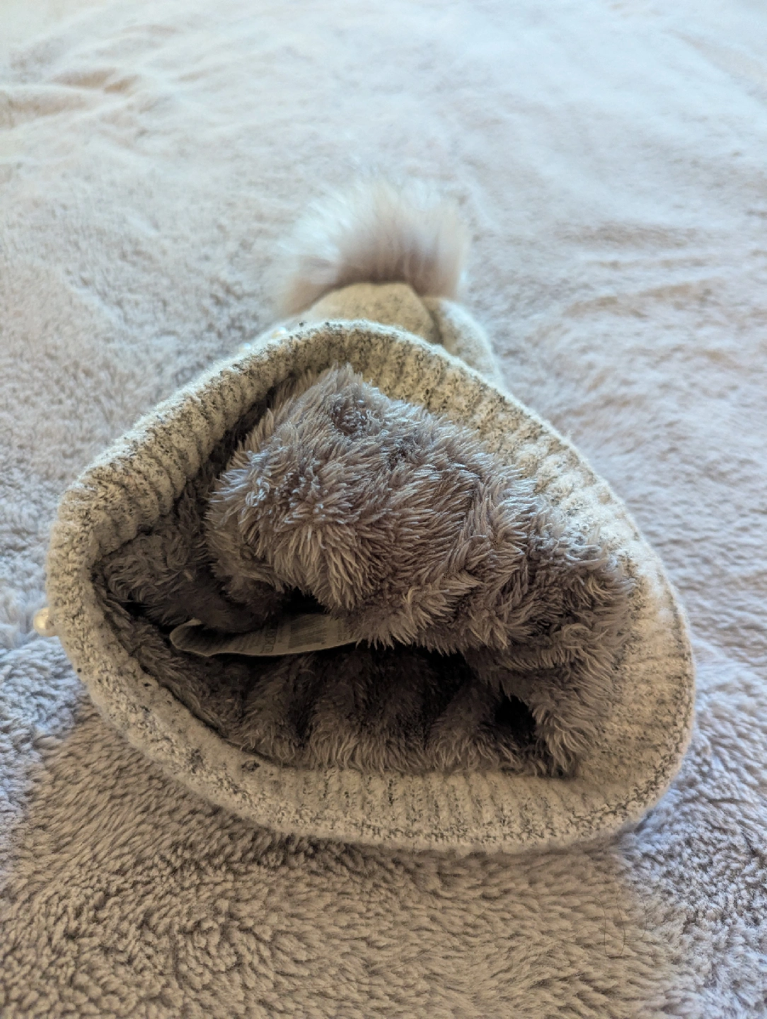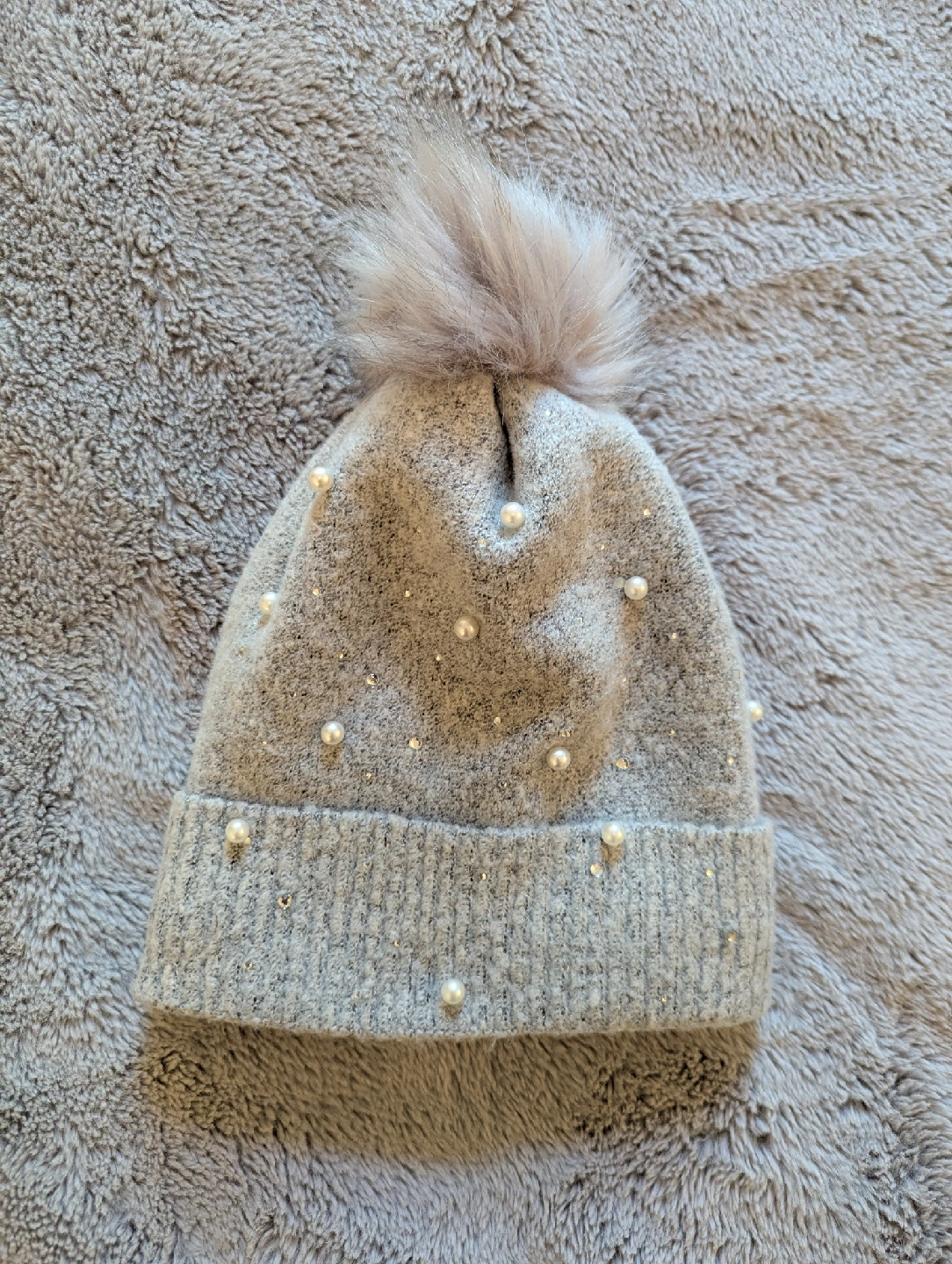 Jolie tuque grise avec des détails de perles. Elle est super chaude et confortable, parfaite pour l'hiver qui arrive! Elle est en excellente condition