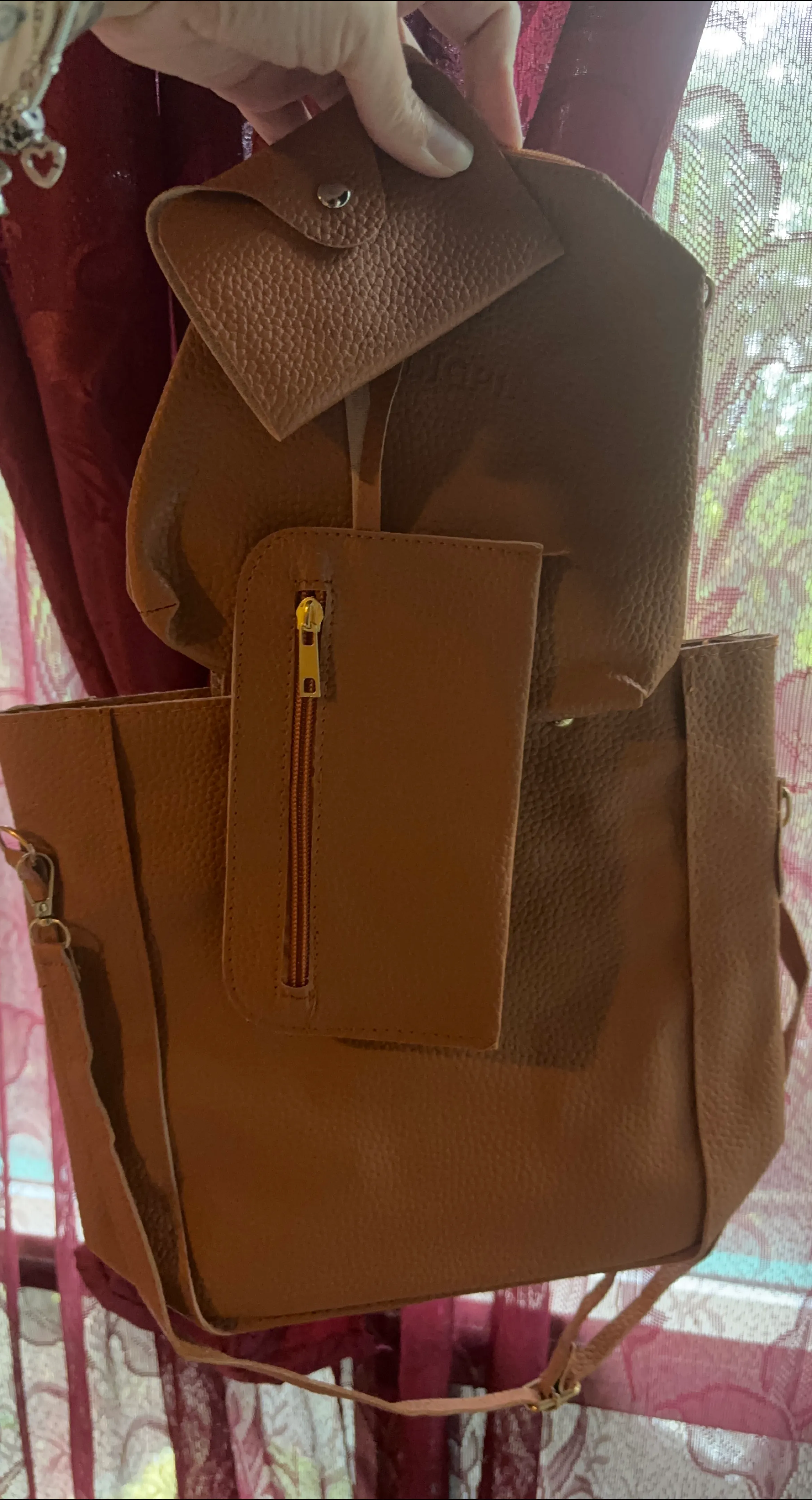 A stylish brown tote bag, perfect for everyday use! It comes with a few matching accessories to keep you organized. The bag is in great condition and ready for a new home!