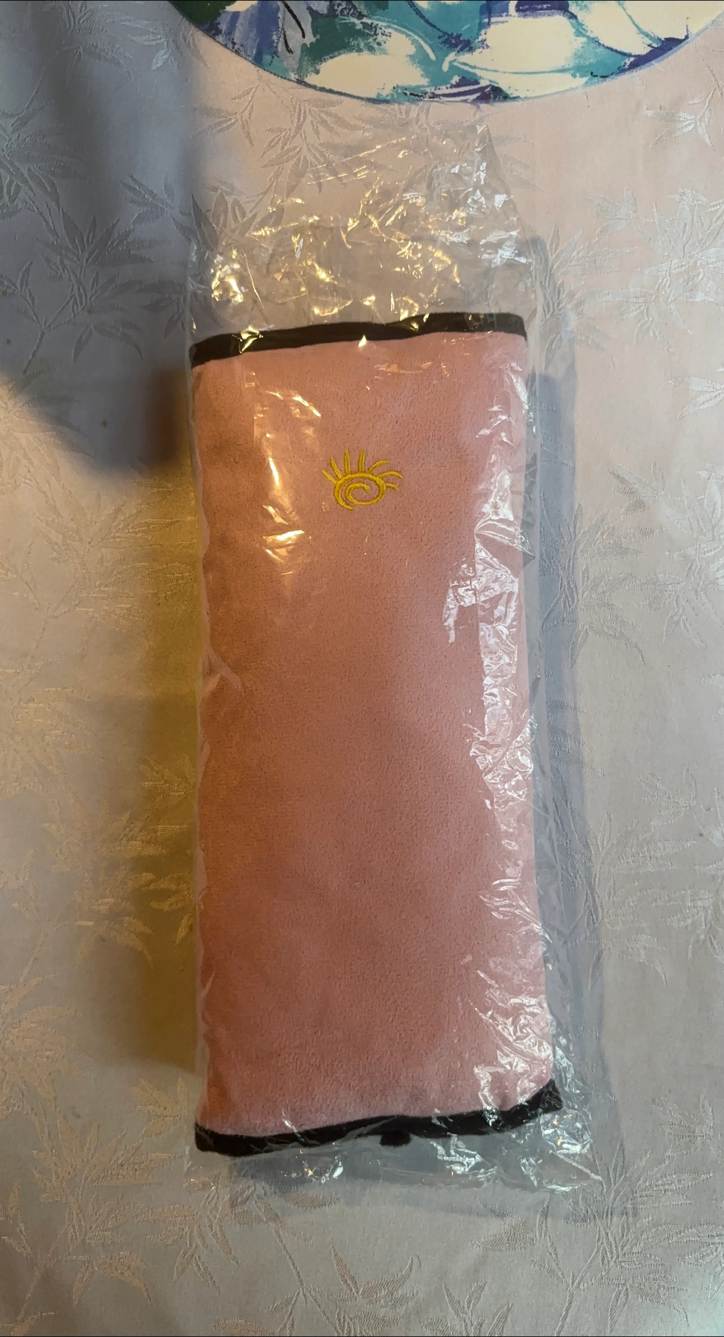 Selling a brand new, still-in-packaging pink seat belt cushion . It has a cute sun embroidery on it and a dark trim. It's super soft !