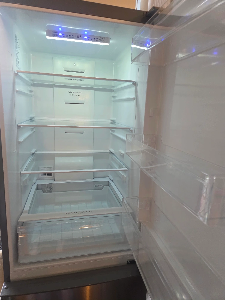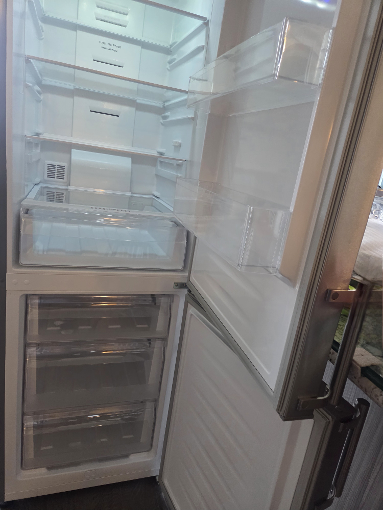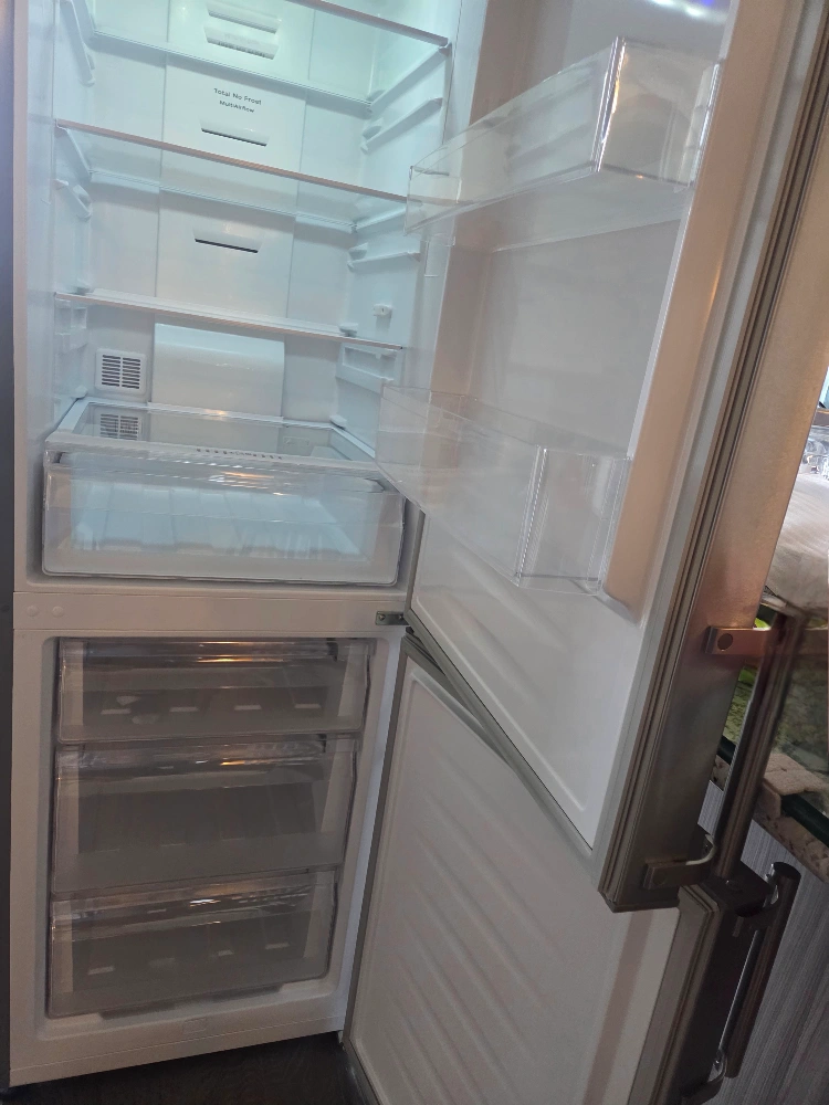 Freezer is at bottom. Stainless steel doors. See the photo for detailed specs.
