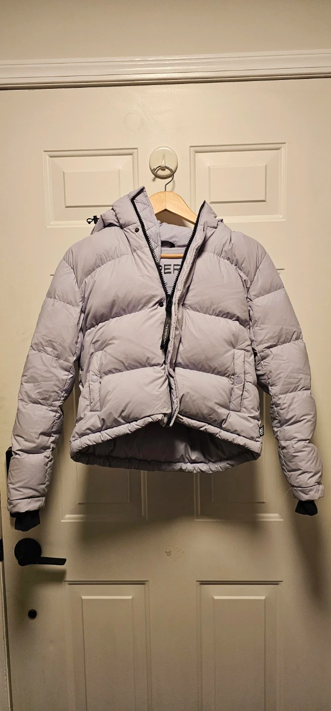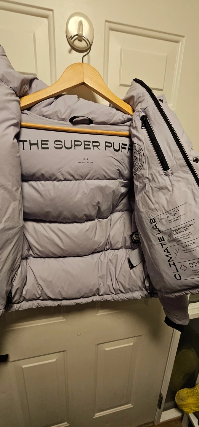 This is The Super Puff jacket in a light lilac colour. It's made with 700+ fill power down for superior warmth. The jacket is water-repellent and wind-resistant, designed in Canada for extreme climates. It's responsibly sourced and made in Vietnam.