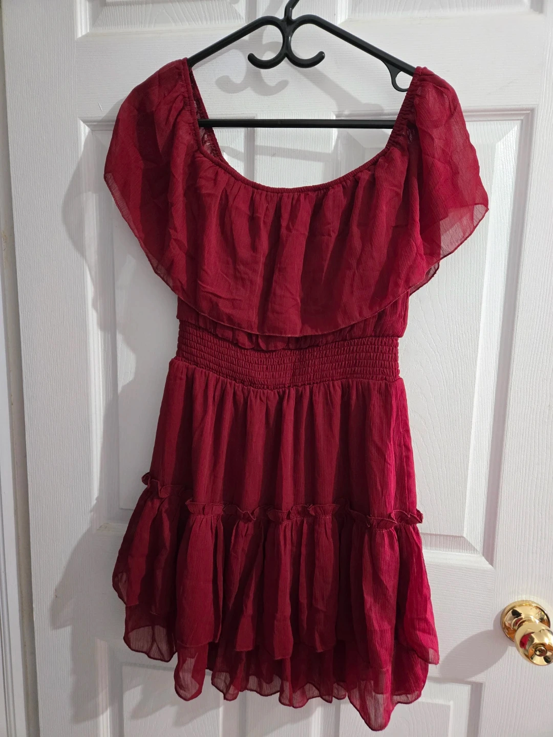This is a women's off-the-shoulder dress. It features a ruffle overlay and a smocked waistband. The hem has tiered ruffles. It's a stylish choice for warm weather occasions!