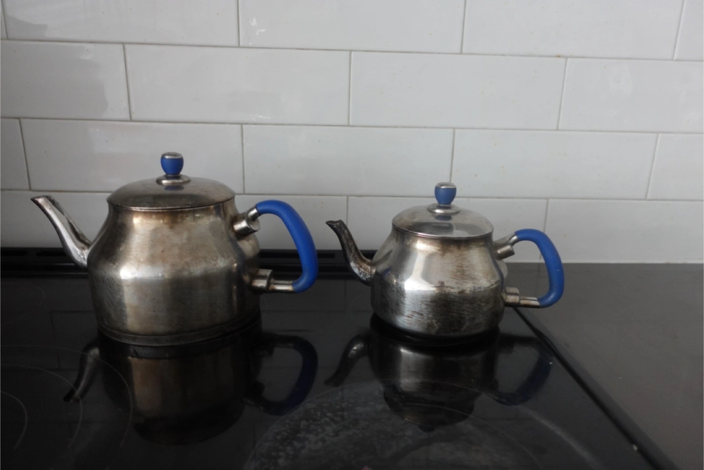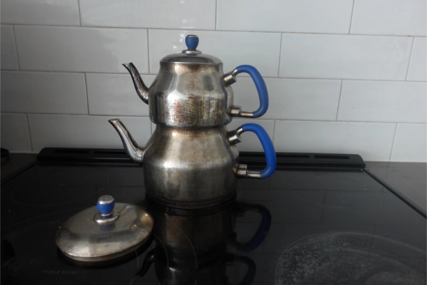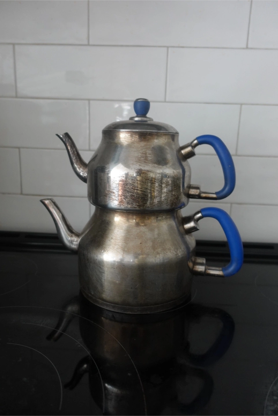 Selling a Turkish kettle/ teapot set. They have a classic design with blue handles. Perfect for tea lovers or collectors!
