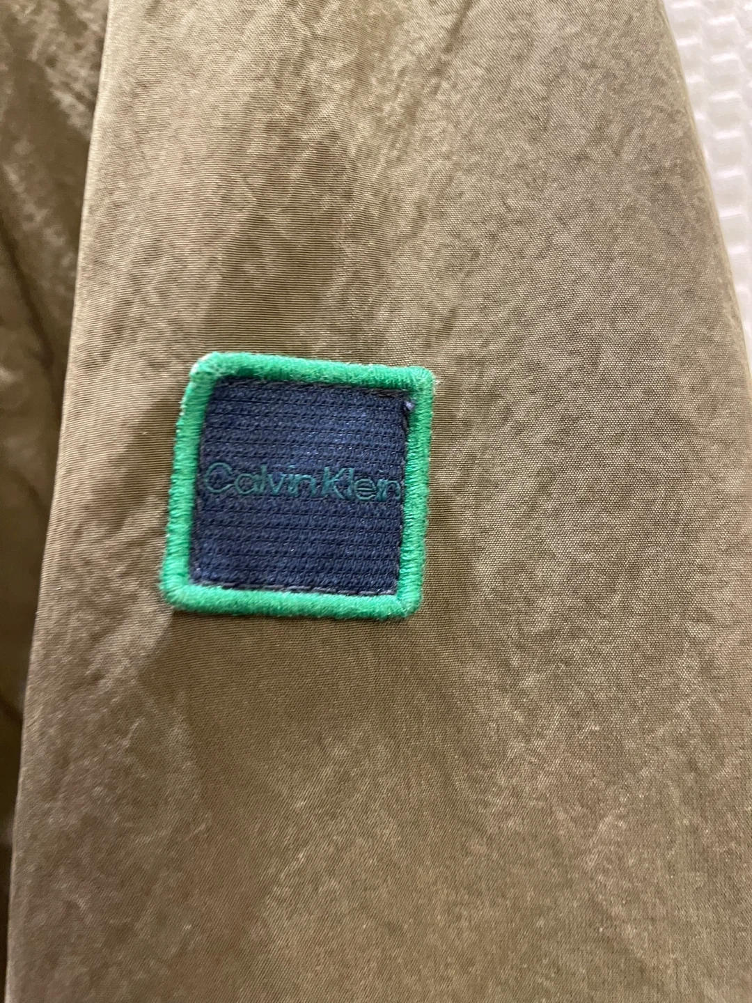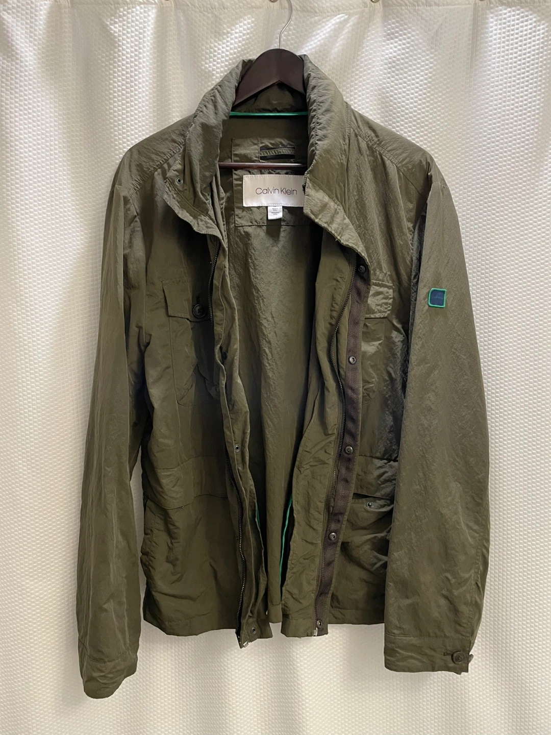Selling a Calvin Klein jacket in a unique olive green colour! It's lightweight and perfect for layering. The jacket features multiple pockets and a stylish design. It's in great condition and ready for a new home!