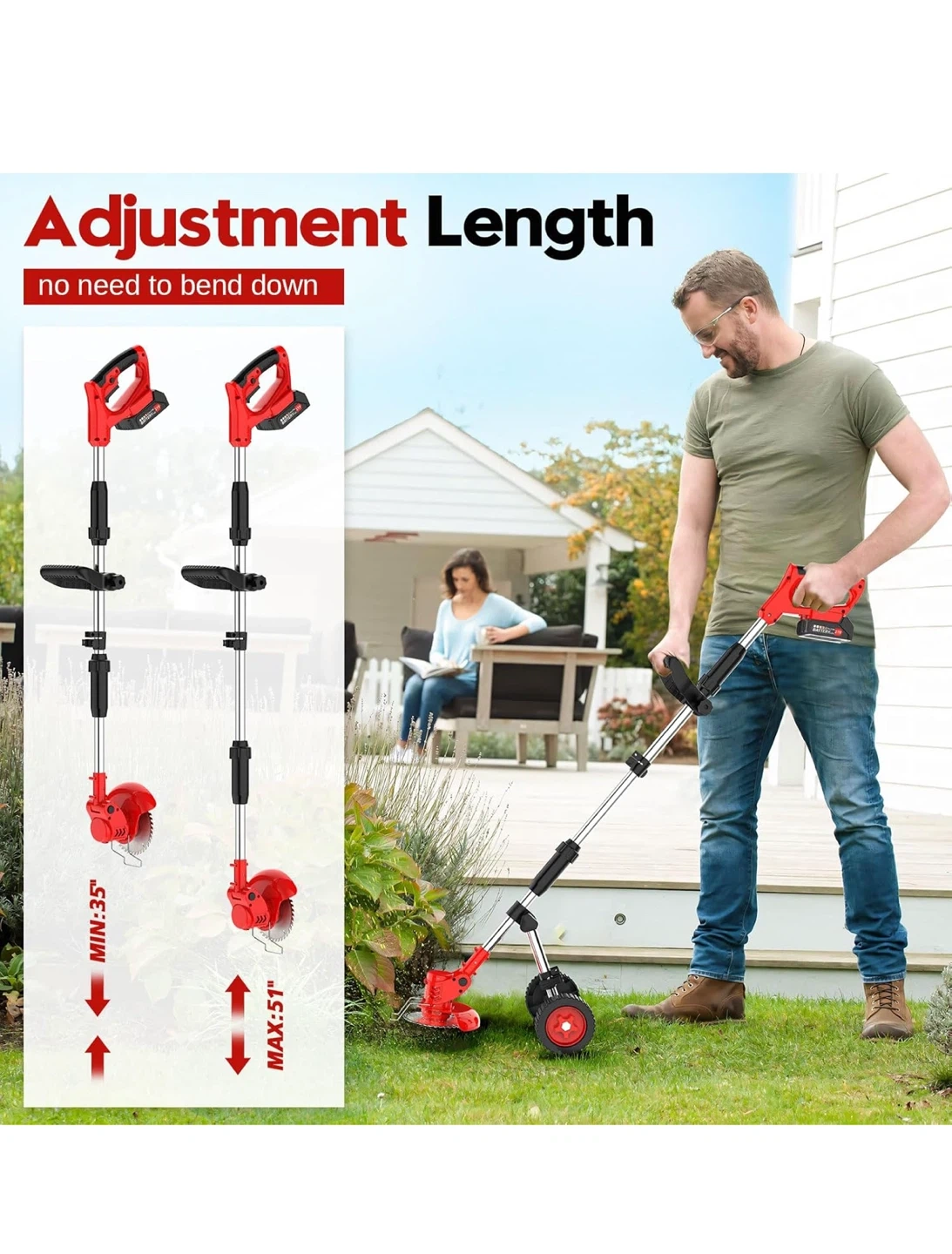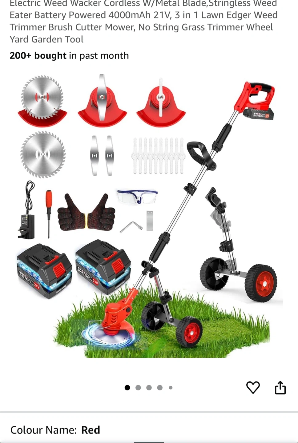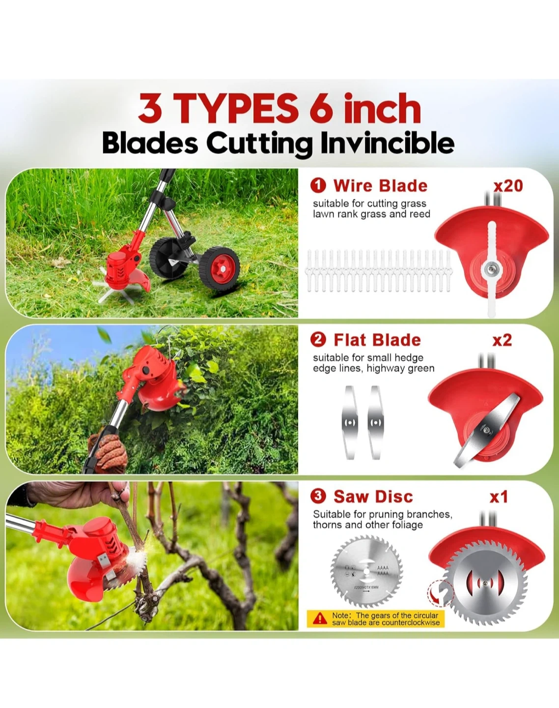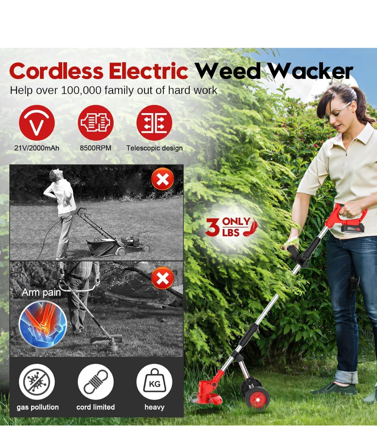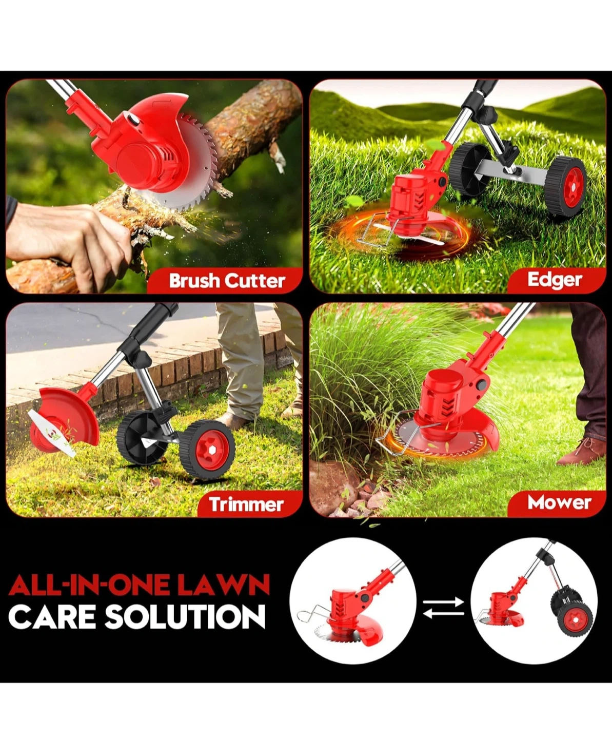 63I'm selling a cordless electric weed wacker that can help you with your lawn care needs! It is a 5-in-1 tool that can be used as a: -Brush cutter -Edger -Trimmer -Mower It features a telescopic design, adjustable height, and stable buckles. It's also lightweight, at only 3 lbs!