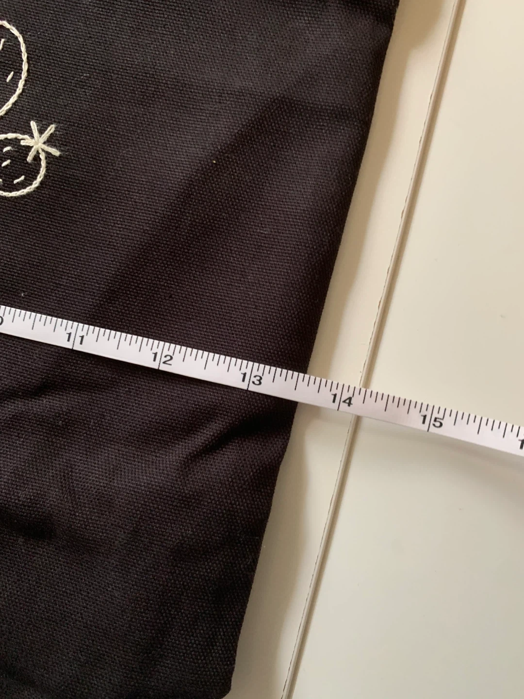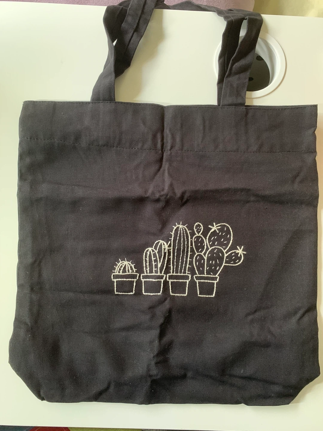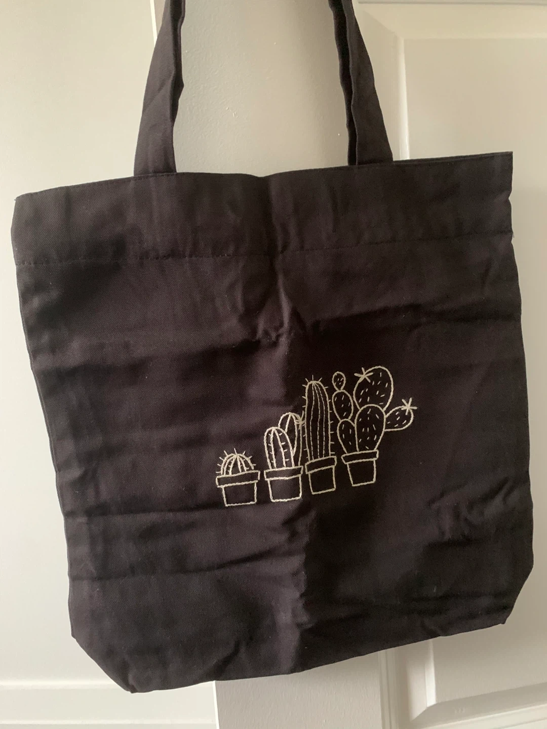 Cute black tote bag with a cactus design! The bag measures approximately 13 inches in width and 14 inches in height, making it a good size for everyday use.