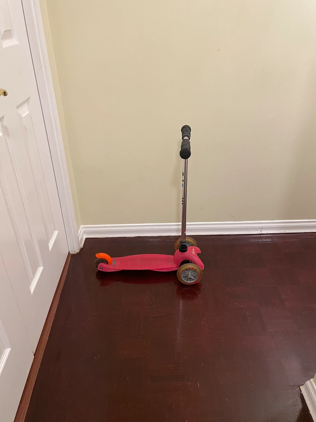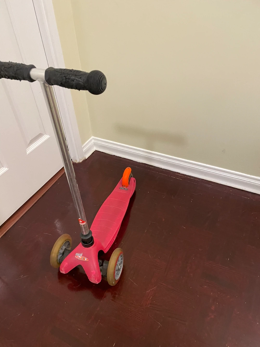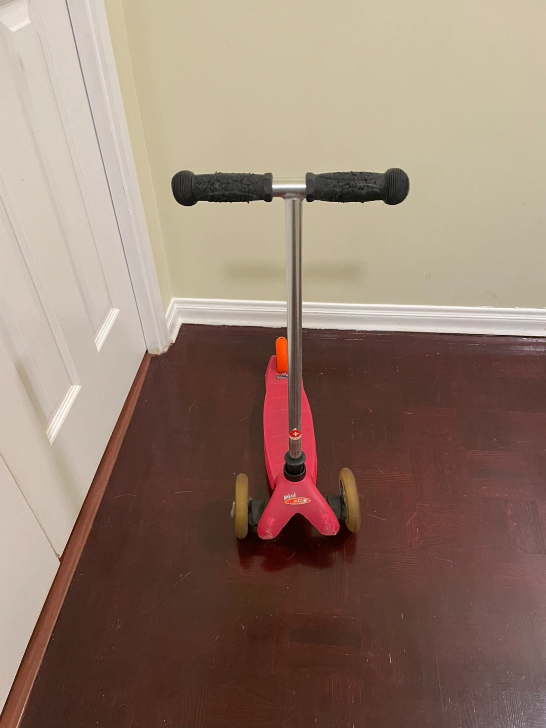 Selling a used Micro Mini scooter in pink! It's perfect for little ones learning to scoot around. It has three wheels for added stability and is lightweight and easy to manoeuvre. Great for kids!