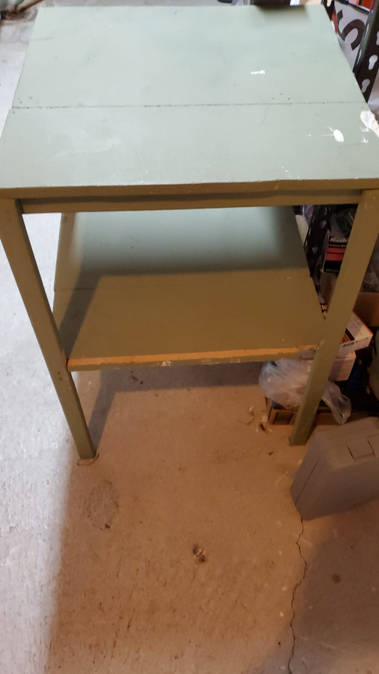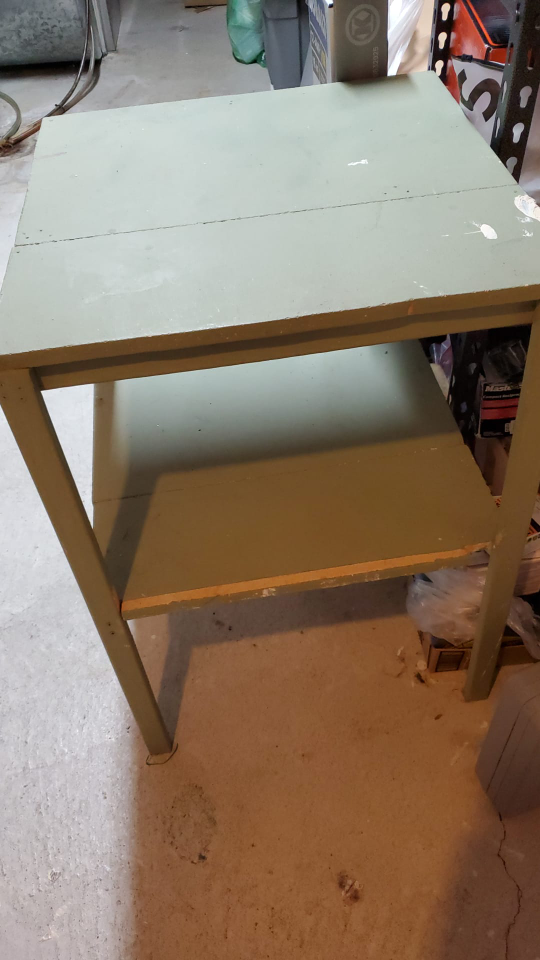 Selling a sturdy green wooden table. It has a convenient shelf underneath for extra storage. Perfect for a garage or basement. Pick up at 40 Lavery Trail Scarborough