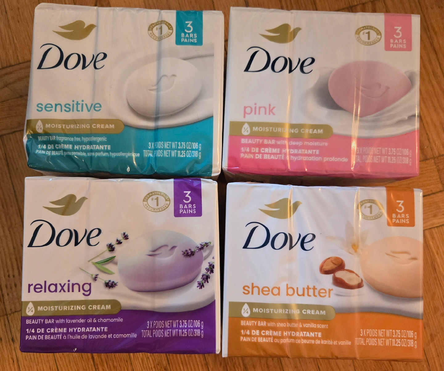1000+$3.50 each package Dove Beauty Bar soap. Each containing three bars. - Sensitive (fragrance-free, hypoallergenic) - Pink (deep moisture) - Relaxing (lavender oil & chamomile) - Shea Butter (shea butter & vanilla scent) Each bar is enriched with 1/4 moisturizing cream, leaving your skin feeling soft and smooth Multiple of each available