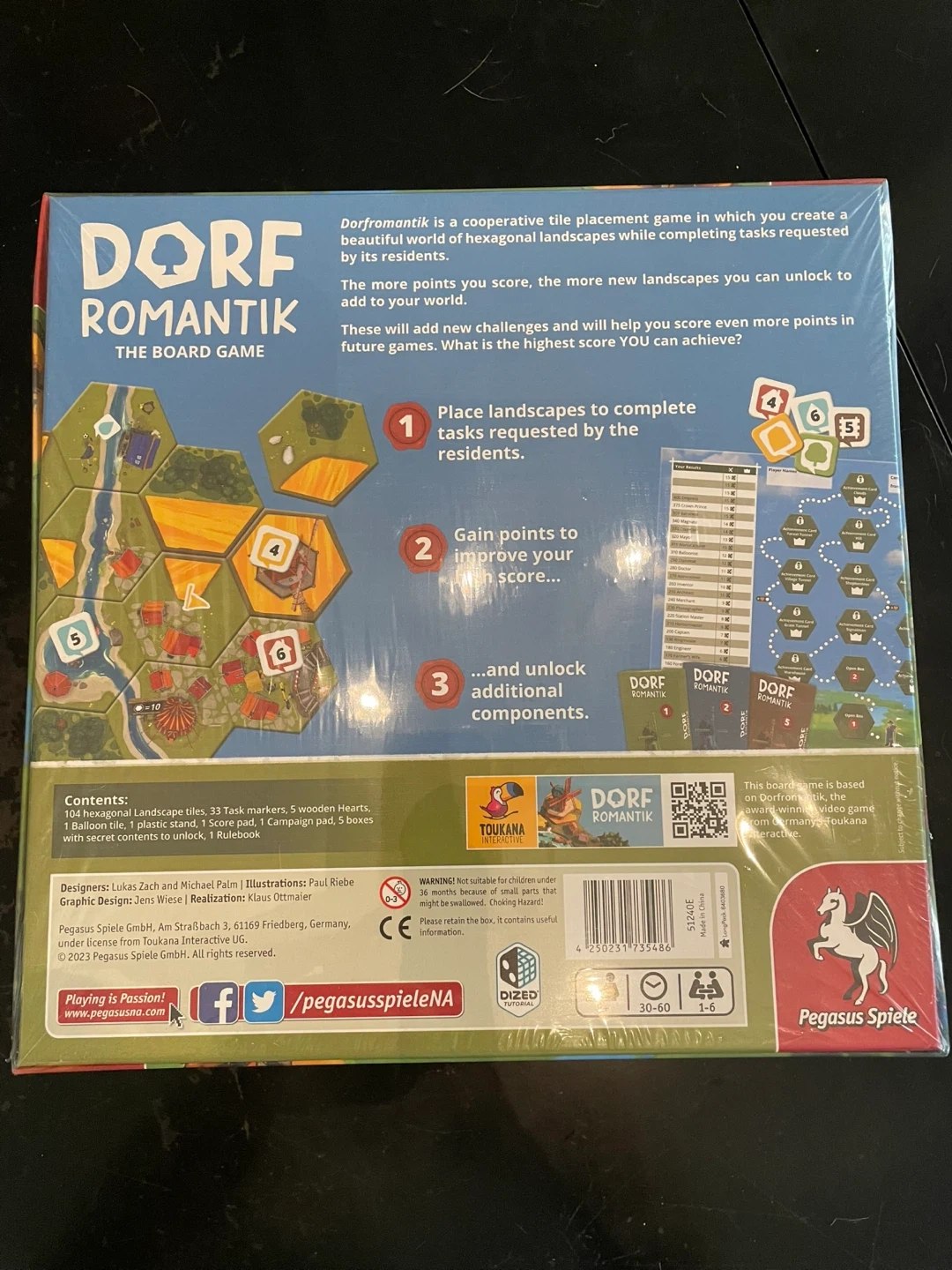 Selling a brand new, still-in-box copy of Dorf Romantik: The Board Game! It's a cooperative tile placement game where you create a beautiful world of hexagonal landscapes while completing tasks requested by the residents. Gain points to improve your score and unlock additional components. Perfect for 1-6 players, ages 8+!