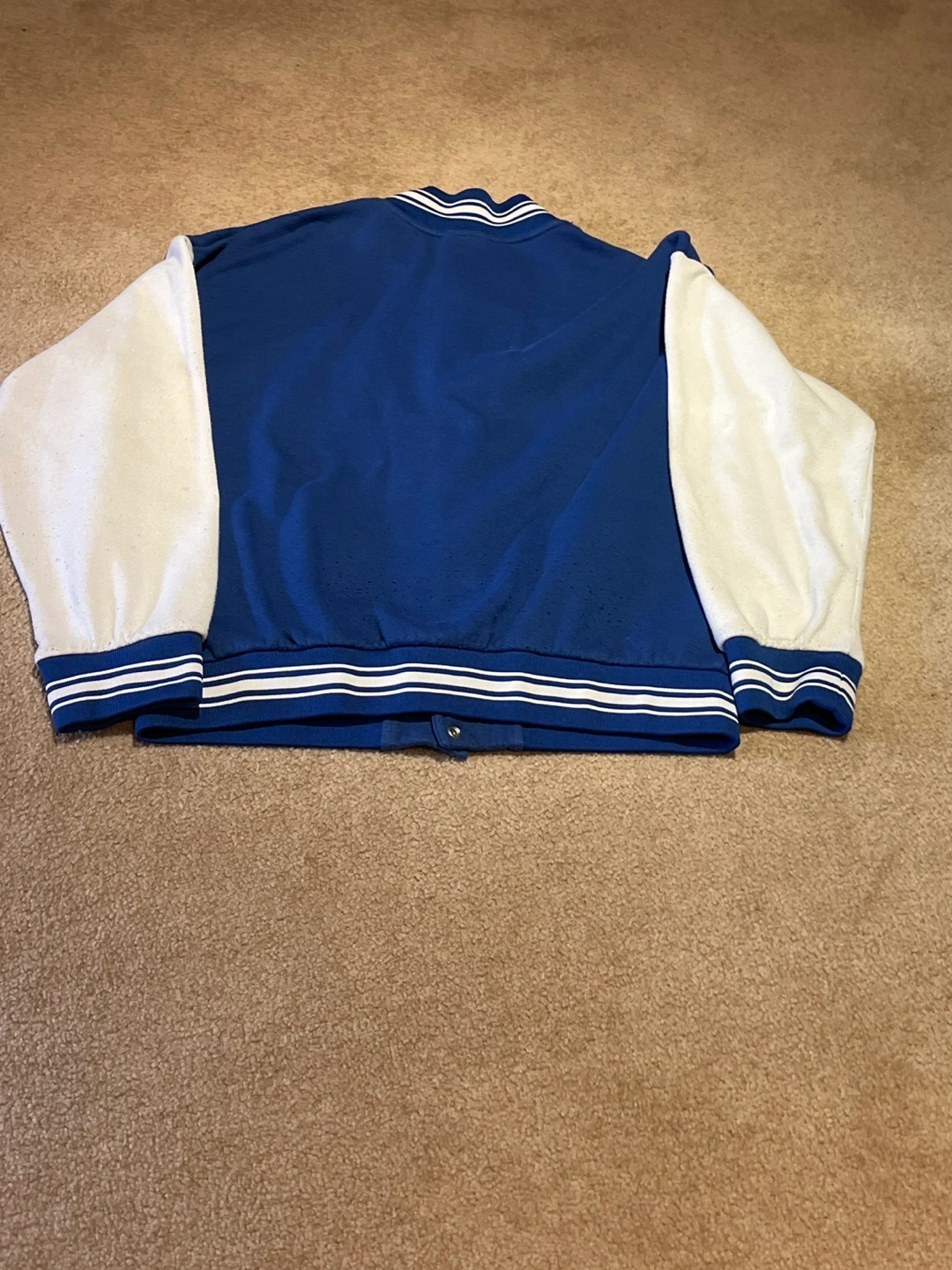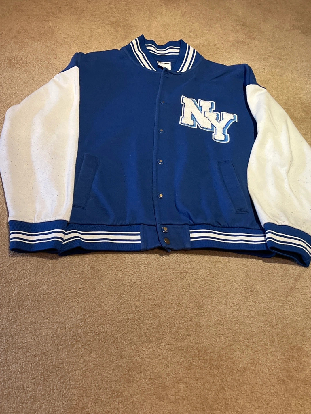 Selling a blue and white varsity jacket. It features the letters 'NY' on the front. Perfect for adding a sporty touch to your wardrobe!