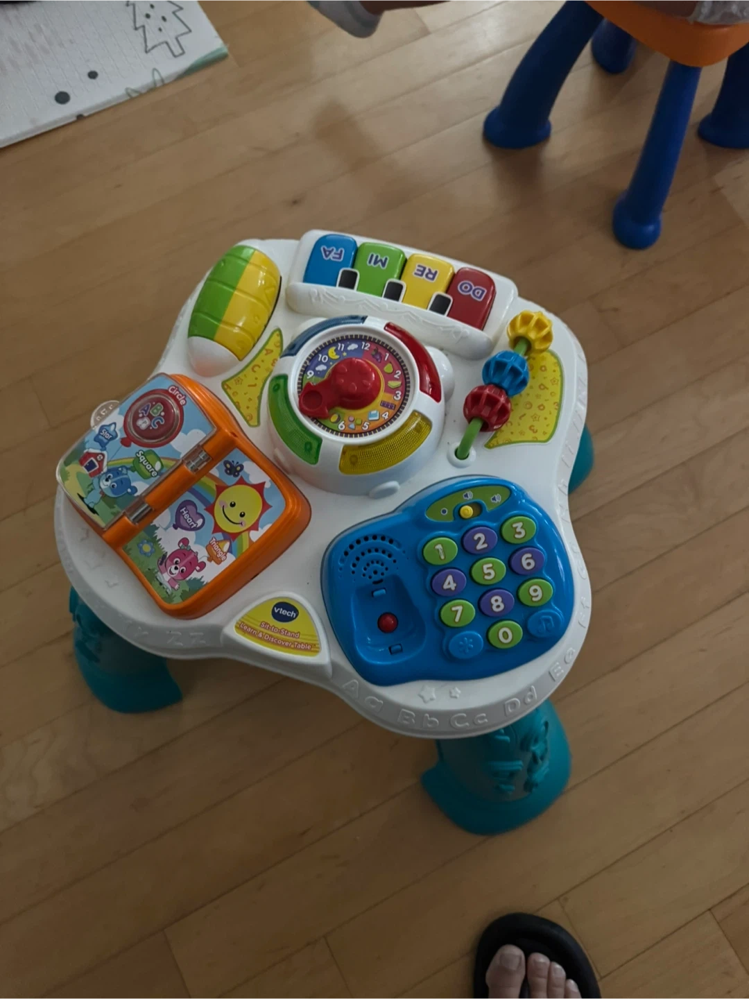 This is a VTech Sit-to-Stand Learn & Discover Table. It has a variety of activities to keep your little one entertained. It features a piano, clock, and number pad for interactive learning and play