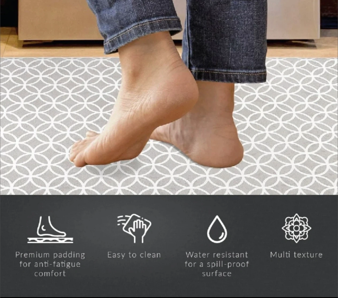 •Premium Cushioned Anti-Fatigue Mat, perfect for kitchens, standing desks, offices, laundry or workshop.