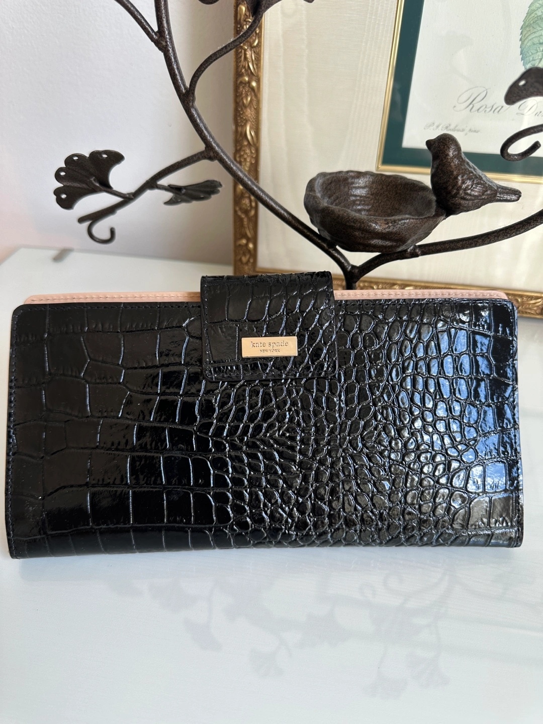 10Selling a Kate Spade wallet in black. It features a stylish crocodile-like texture. It's in great condition and ready for a new home!