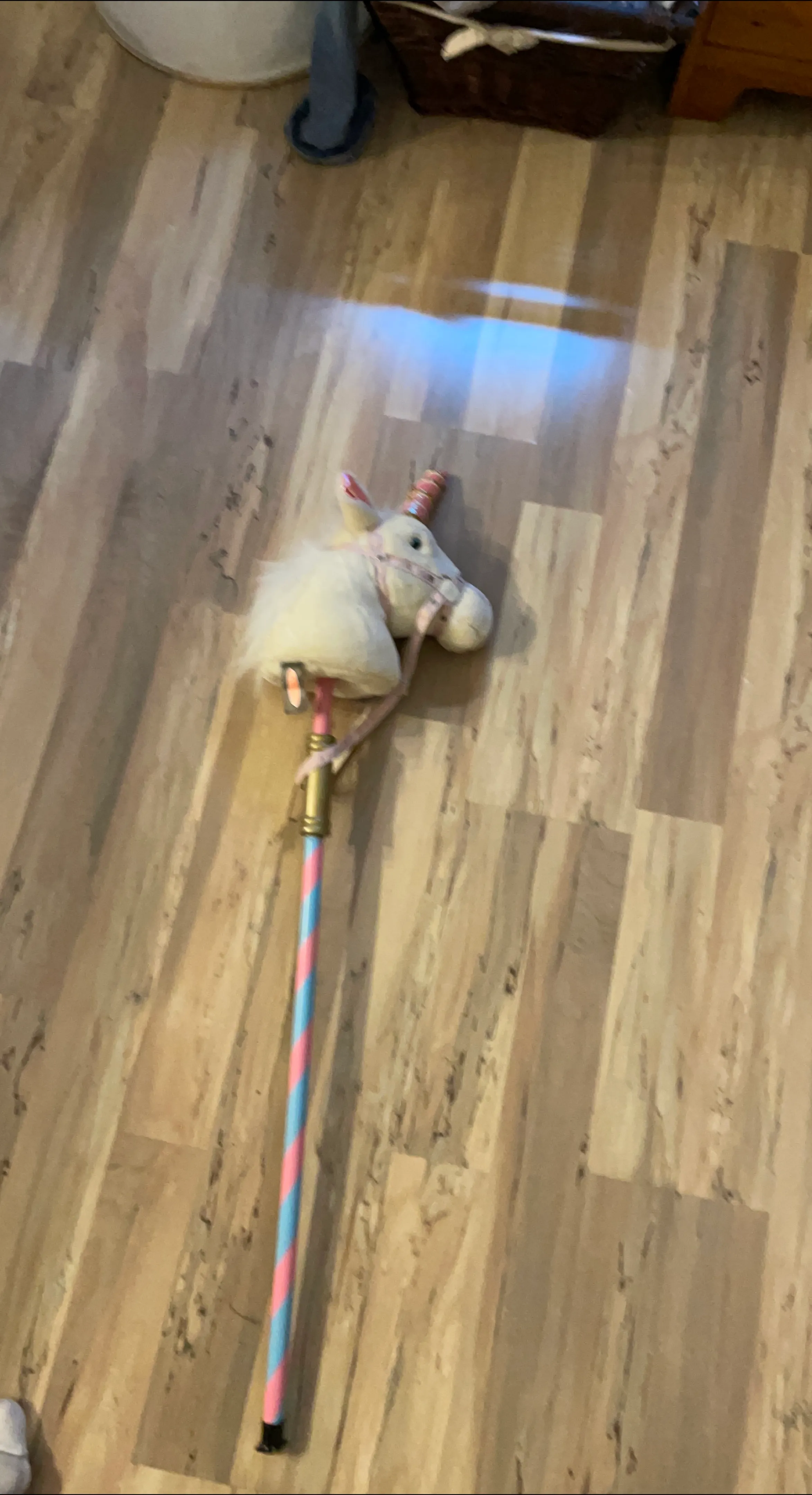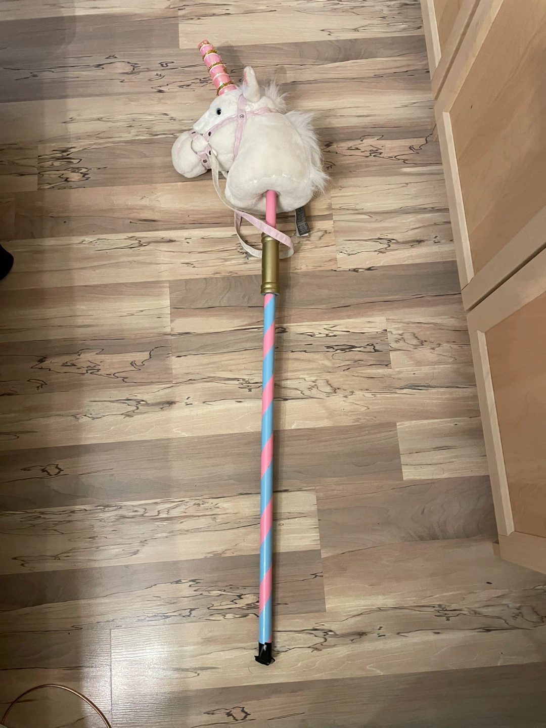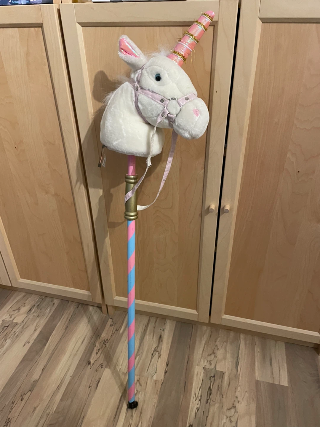 A cute plush unicorn hobby horse toy! It features a white plush head with a pink and gold horn, attached to a striped blue and pink pole. Perfect for imaginative play for kids
