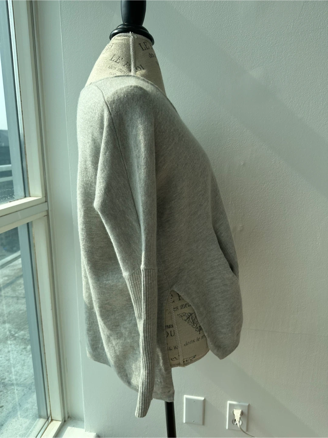 Selling a Babaton sweater in size S/M. It's a light grey colour and features a V-neck and pockets. Perfect for layering or wearing on its own!