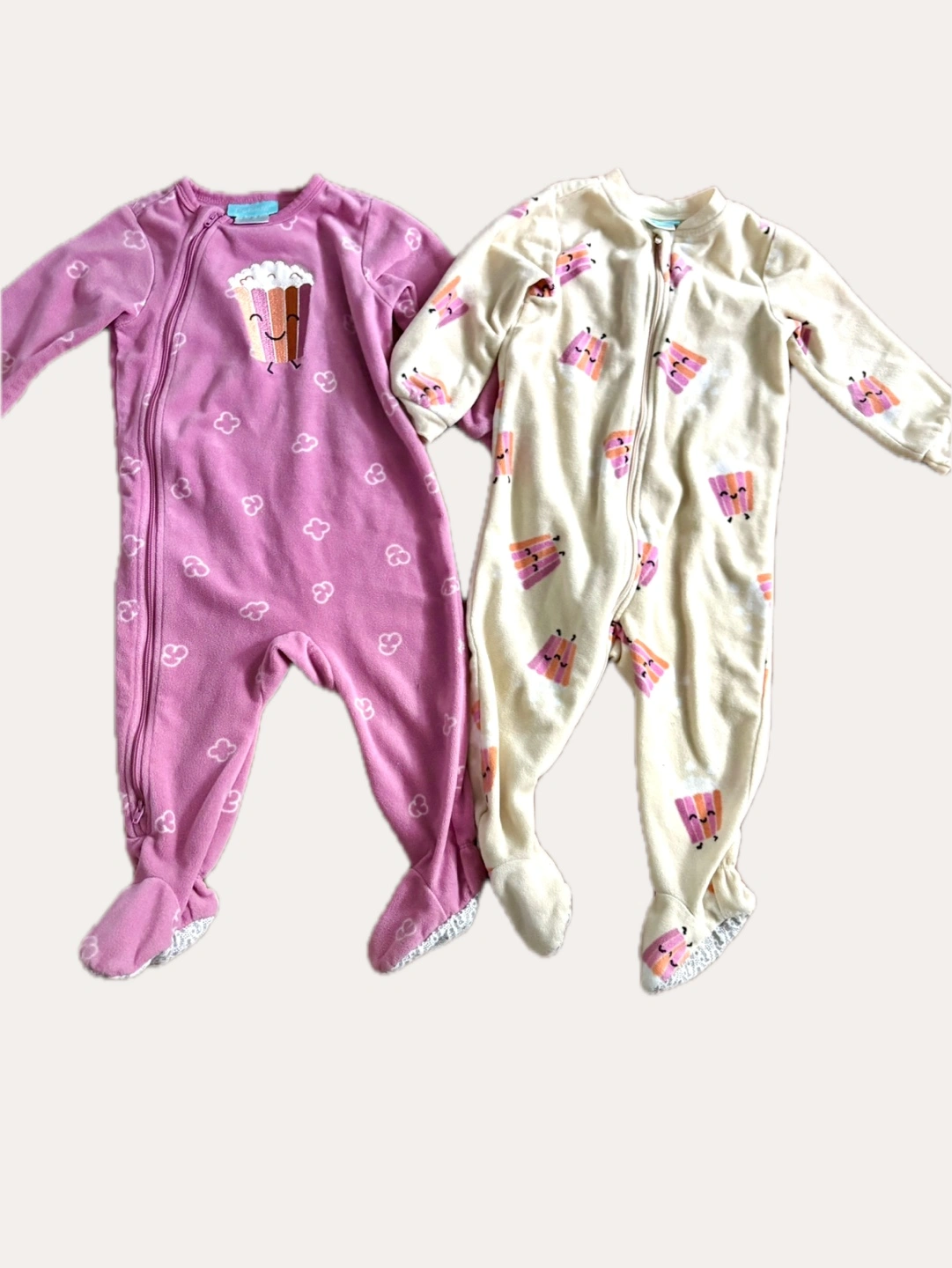 Two adorable baby fleece sleepers in size 12m. One is a lovely pink with a popcorn design, and the other is a cream colour, also with a cute popcorn theme. Perfect for keeping your little one cozy and comfy