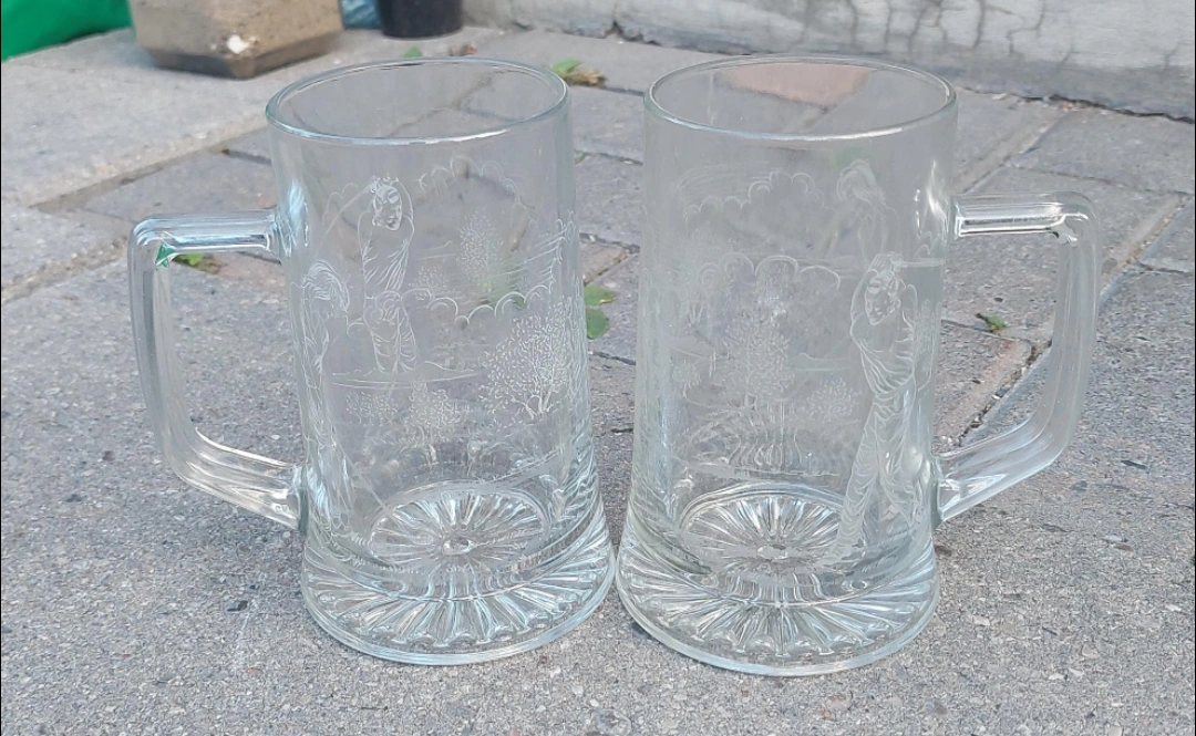 Selling a pair of clear glass beer mugs. They feature a detailed etched design of a golfing scene. Perfect for your next get-together!