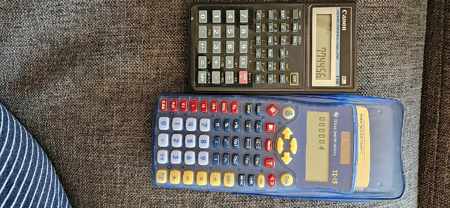 Selling two calculators: a Canon F-720Z and a Texas Instruments TI-15. Both are in good working condition and ready for use!