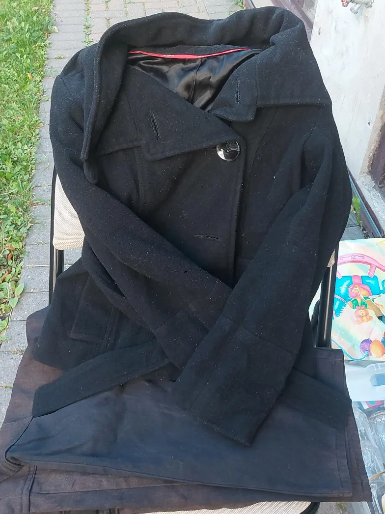Here's a stylish black coat, perfect for fall! It's a wool blend with a belted waist and button closure. Great for layering and staying warm on those chilly days