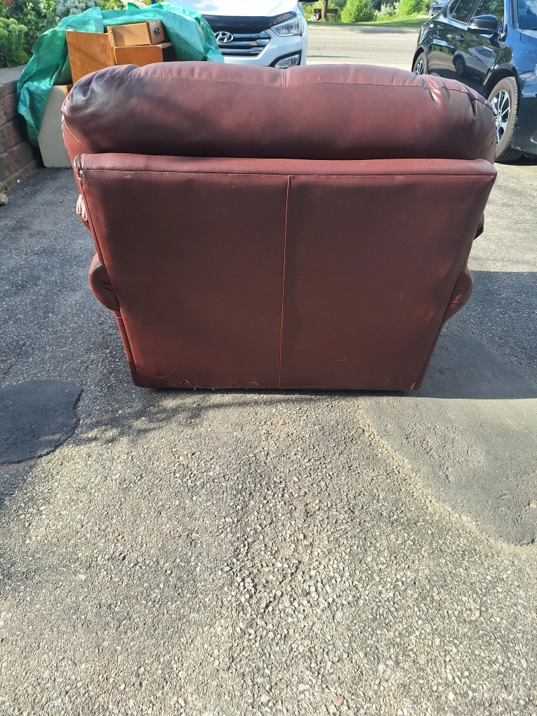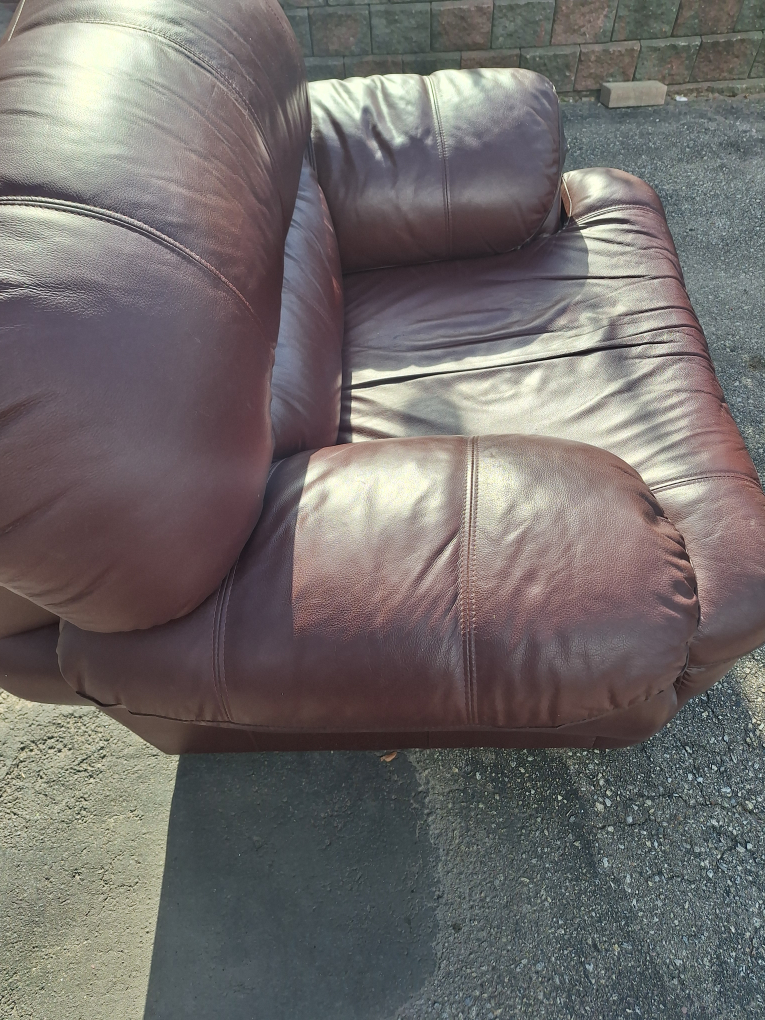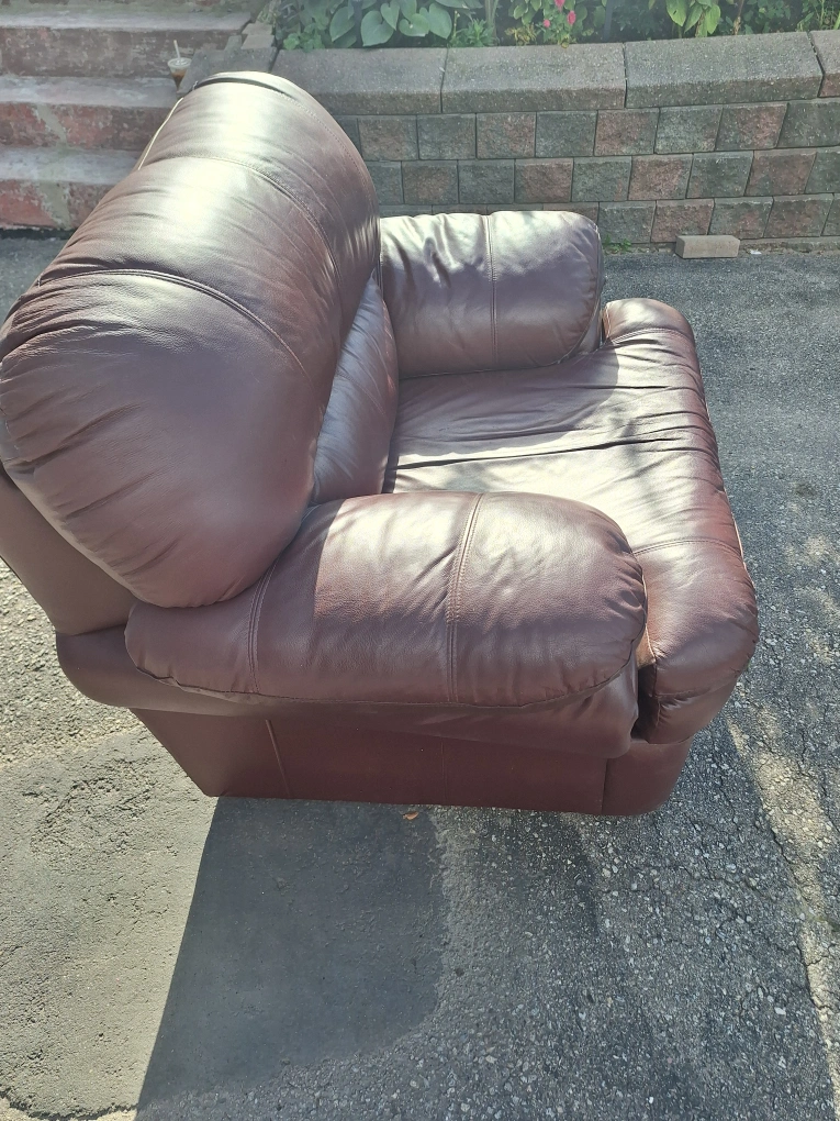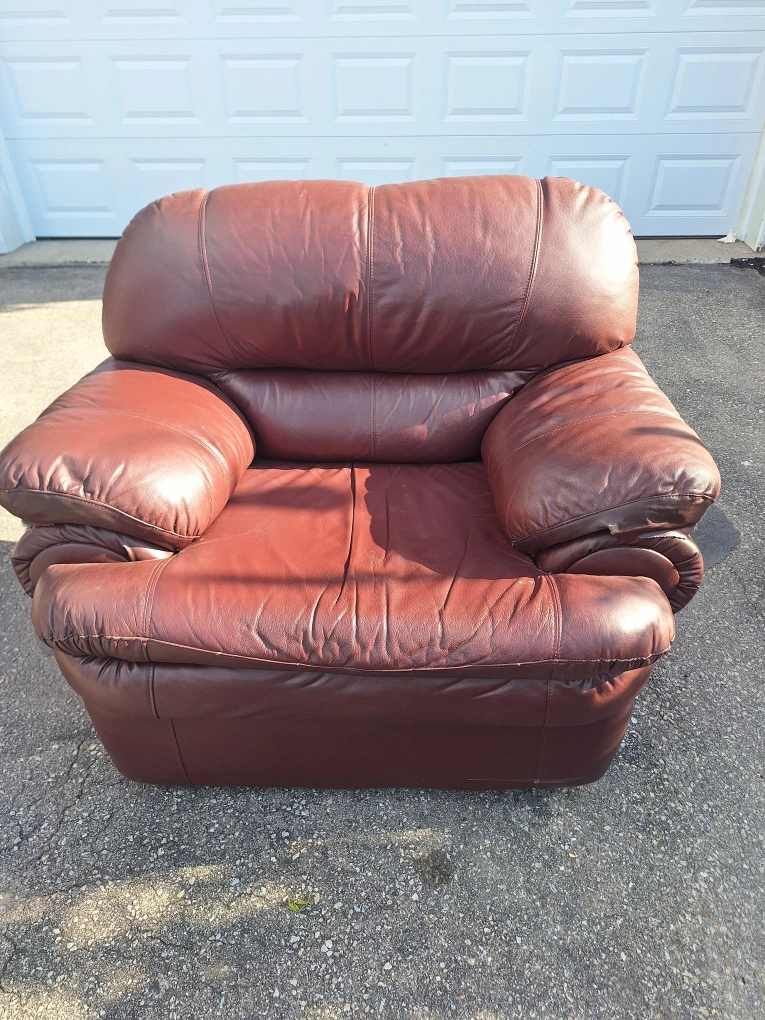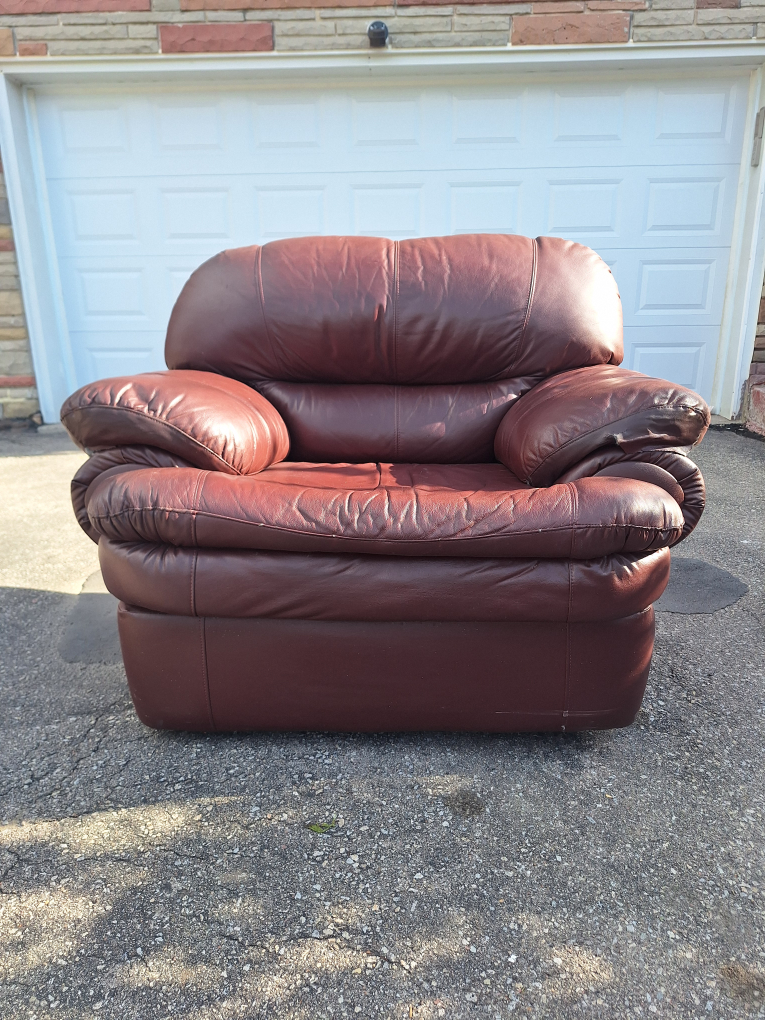 Comfortable armchair in a brown-red leather finish. It's in fair condition and ready for a new home. Perfect for adding a cozy touch to any living space! Take it as is.