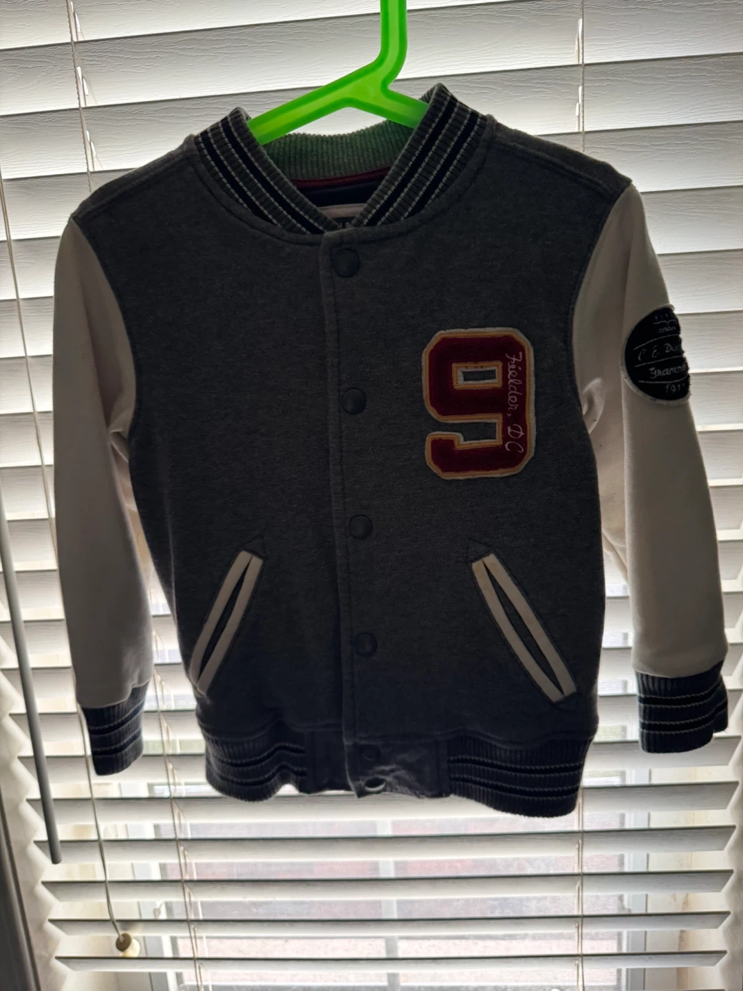 Selling a cute kids' varsity jacket in size 3T! It's grey with white sleeves and has a sporty design. Perfect for keeping your little one warm and stylish