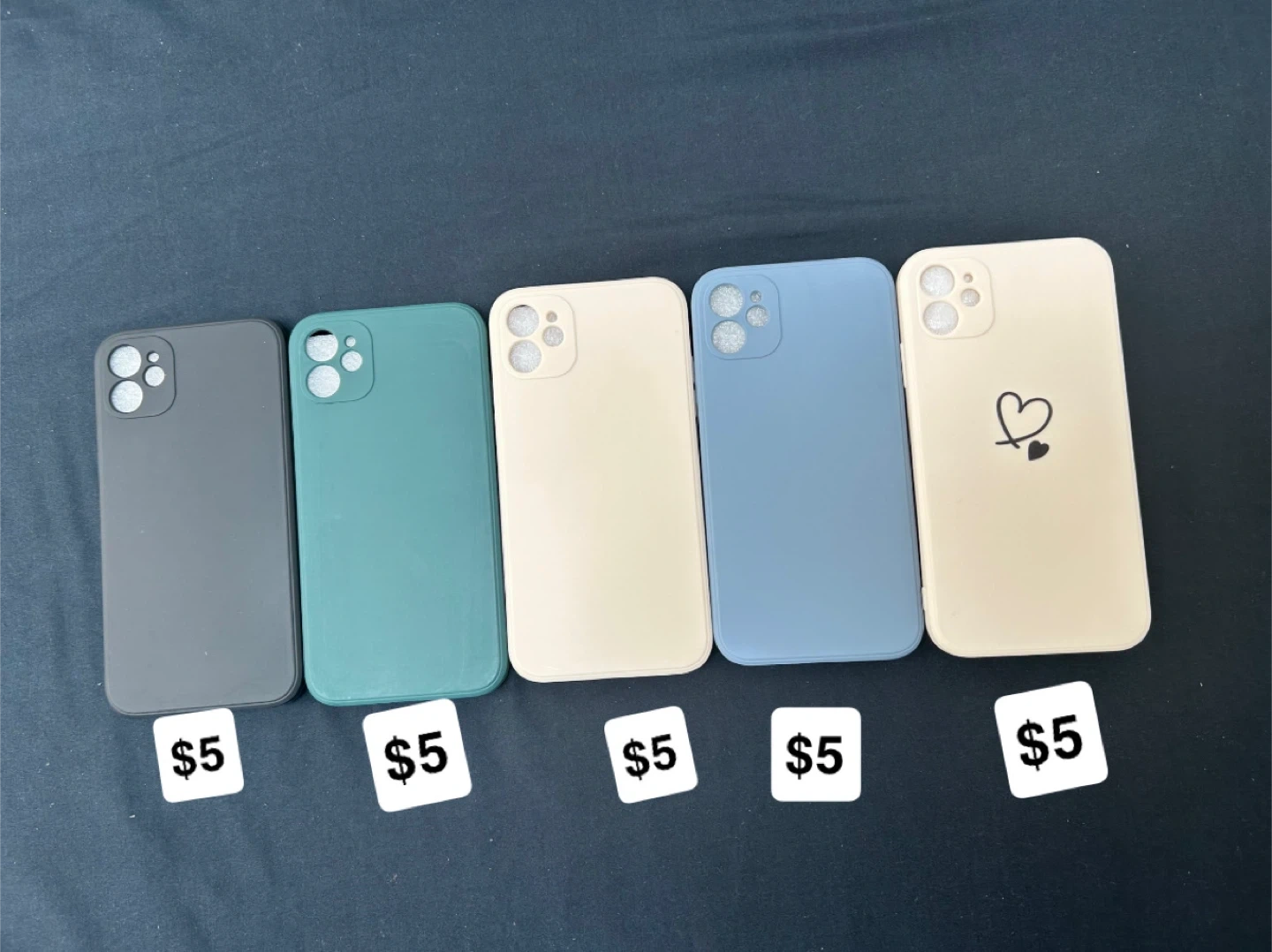 Brand new Selling iPhone 11 phone cases for only $5 each! Available in a variety of colours: gray, teal, beige, and blue. The beige case has a cute heart design