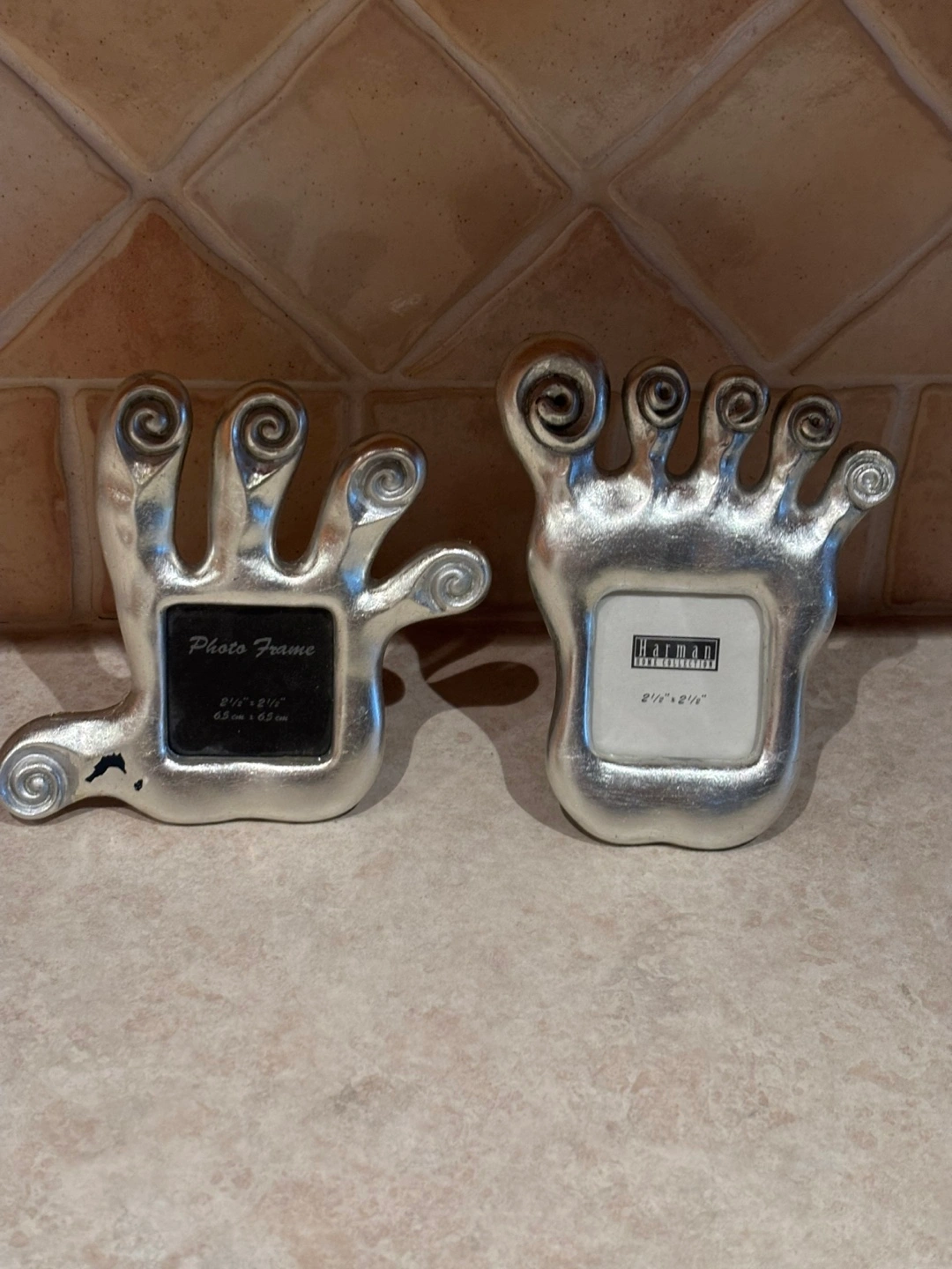 Hand and foot picture frames with silver foil covering. Hand has small piece of foil missing. Can be repainted. Holds 2.5” x 2.5” pics PU Weston Rd & Sheppard. Toronto No holds