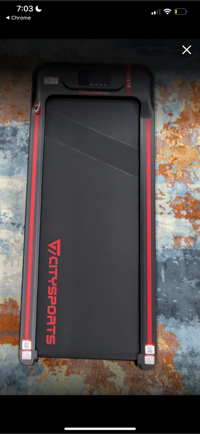 Selling a Citysports treadmill in great condition! It's slim and compact, perfect for smaller spaces. The red accents add a nice touch. It's lightweight and portable, making it easy to move around if needed