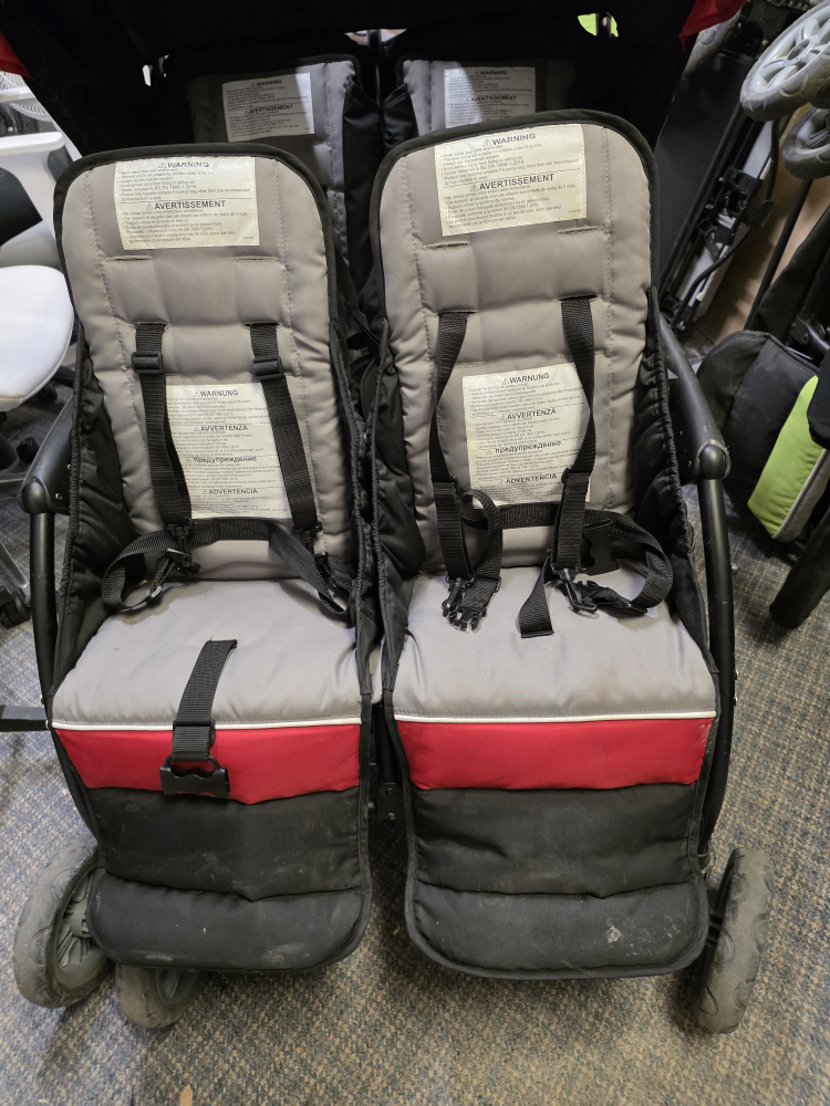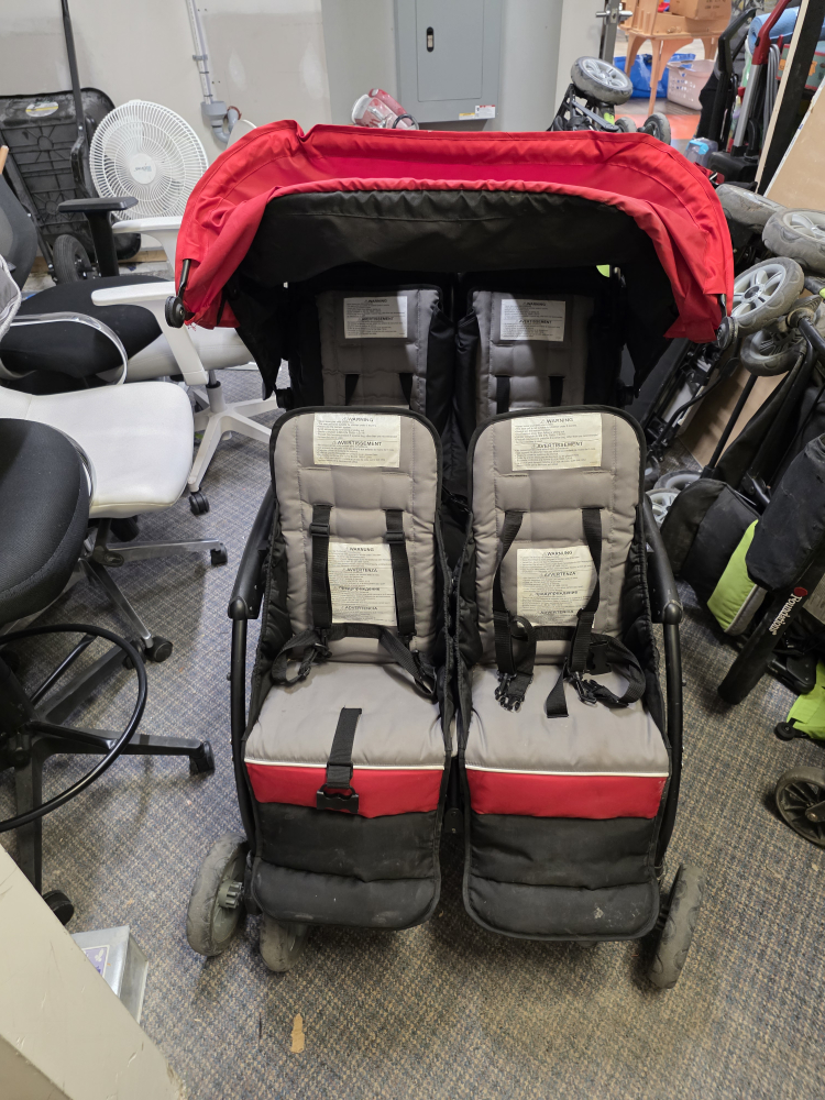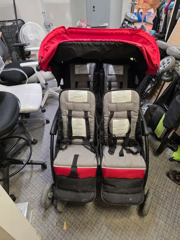 Selling a used double stroller in red and black. It's in good condition and ready for your little ones! Perfect for walks around the neighbourhood or trips to the park. It has a sturdy frame and comfortable seating for 4 children.