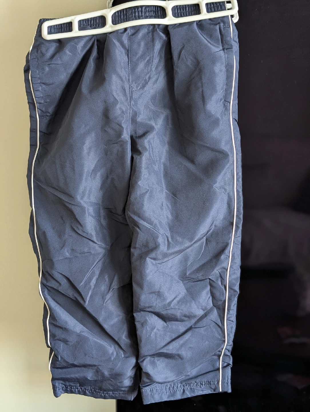 These are a pair of navy blue track pants with lining. They have a white stripe down the side. They would be great for sports or just lounging around the house! size 5y