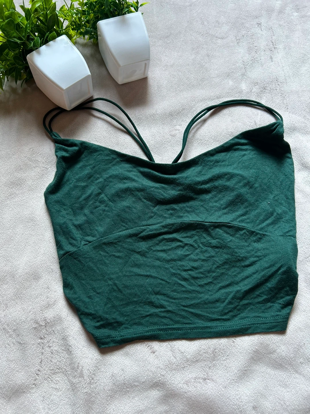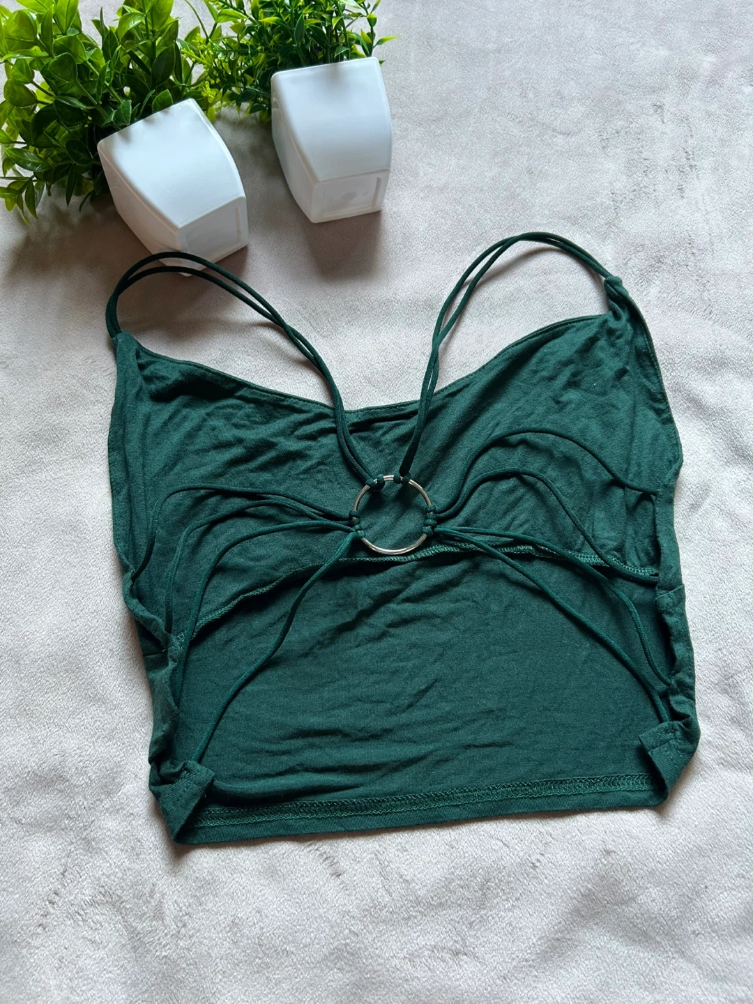 Selling a cute green crop top! It's in great condition and ready for a new home. The material is soft and comfy, perfect for everyday wear. It has a unique design with string straps and a ring detail in the front