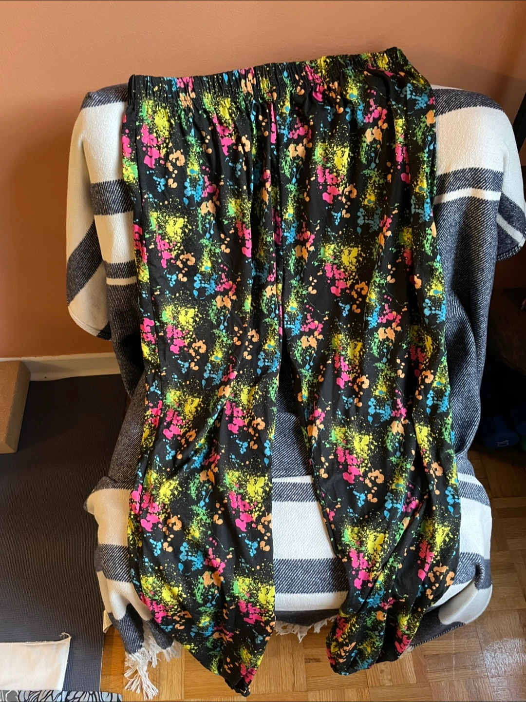 Comfy and colourful pants with a fun paint splatter design! These are a Large but can be pinned to M/S.