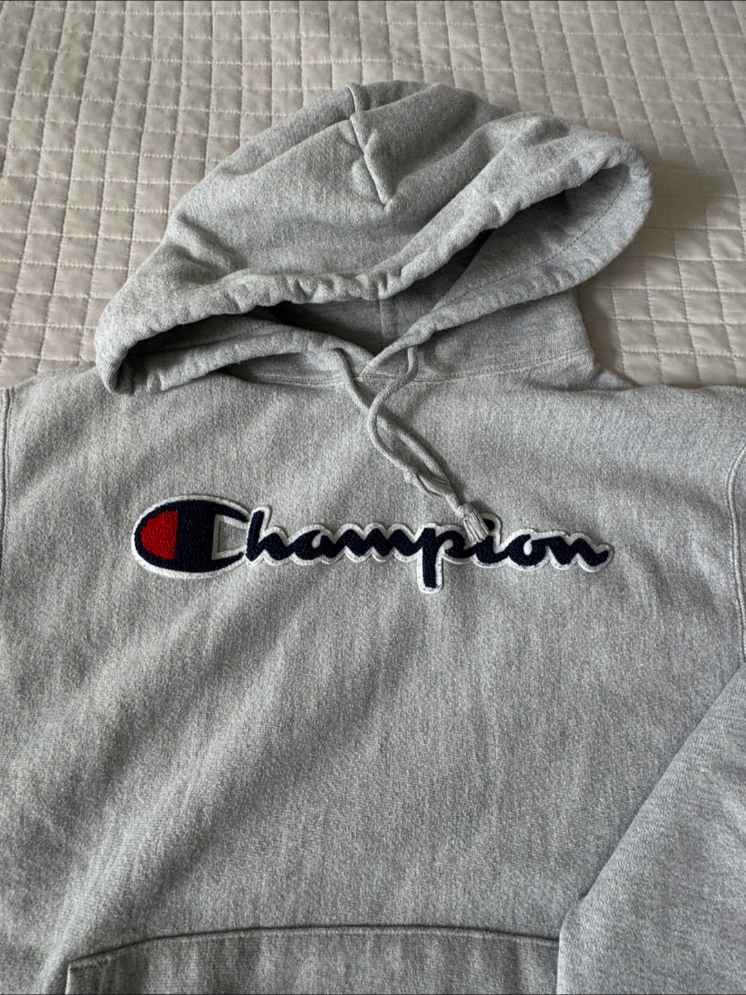 Cozy Champion Reverse Weave hoodie in a nice grey colour. It's a size medium and in great condition. Perfect for staying warm and stylish!
