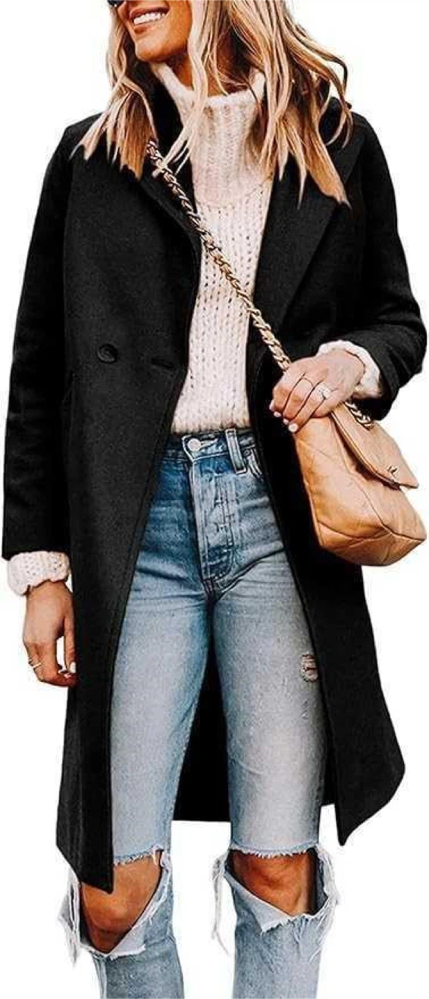 22Selling a women's wool blend lapel pea coat in black, size medium. Based on the size chart, the coat measures approximately: - Shoulder: 15.9 inches - Bust: 40.2 inches - Waist: 37.0 inches - Length: 40.9 inches - Sleeve: 24.2 inches