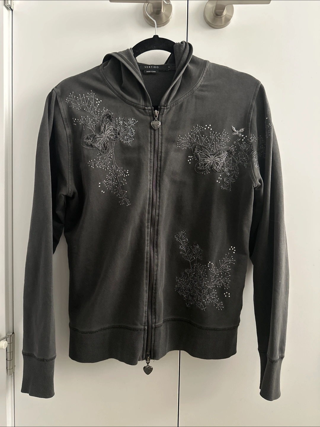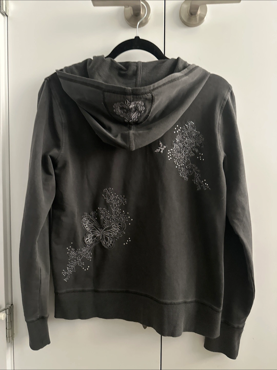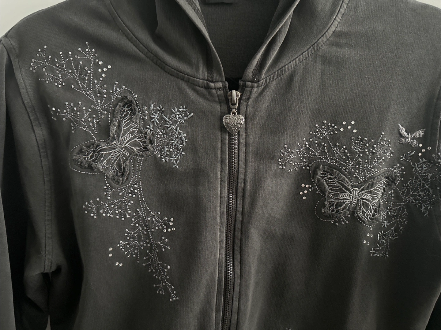 Cozy Vertigo hoodie in a dark grey colour. Features beautiful butterfly and floral embellishments with delicate beading. Perfect for adding a touch of whimsy to your casual wear